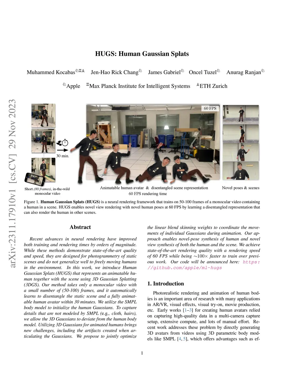 Recent advances in neural rendering have improved both training and rendering times by orders of magnitude. While these methods demonstrate state-of-the-art quality and speed, they are designed for photogrammetry of static scenes and do not generalize well to freely moving humans in the environment. In this work, we introduce Human Gaussian Splats (HUGS) that represents an animatable human together with the scene using 3D Gaussian Splatting (3DGS). Our method takes only a monocular video with a small number of (50-100) frames, and it automatically learns to disentangle the static scene and a fully animatable human avatar within 30 minutes. We utilize the SMPL body model to initialize the human Gaussians. To capture details that are not modeled by SMPL (e.g. cloth, hairs), we allow the 3D Gaussians to deviate from the human body model. Utilizing 3D Gaussians for animated humans brings new challenges, including the artifacts created when articulating the Gaussians. We propose to jointly optimize the linear blend skinning weights to coordinate the movements of individual Gaussians during animation. Our approach enables novel-pose synthesis of human and novel view synthesis of both the human and the scene. We achieve state-of-the-art rendering quality with a rendering speed of 60 FPS while being ~100x faster to train over previous work. Our code will be announced here: https://github.com/apple/ml-hugs