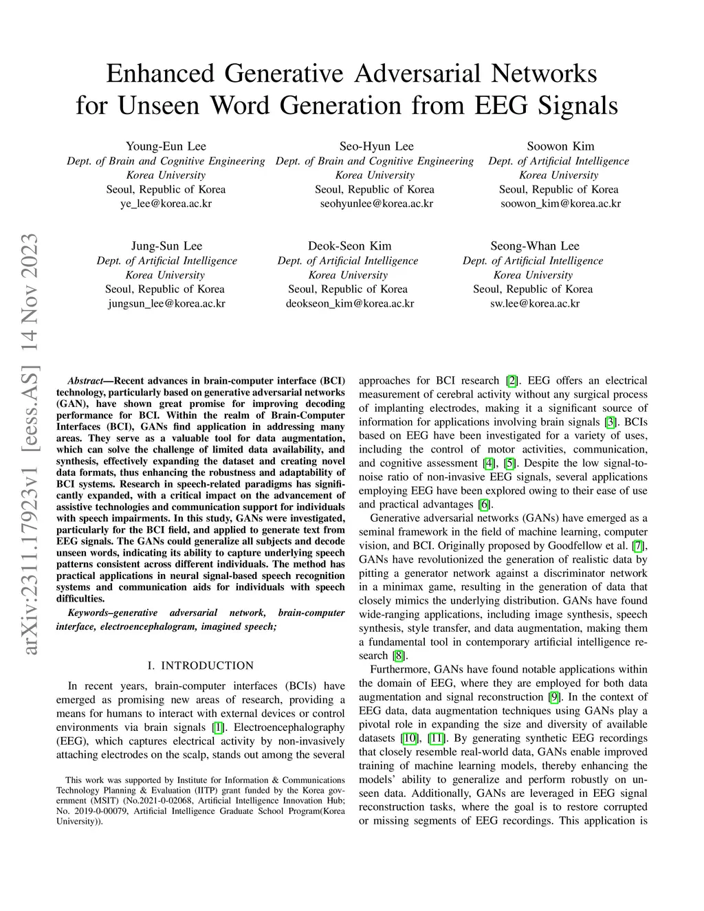 Recent advances in brain-computer interface (BCI) technology, particularly based on generative adversarial networks (GAN), have shown great promise for improving decoding performance for BCI. Within the realm of Brain-Computer Interfaces (BCI), GANs find application in addressing many areas. They serve as a valuable tool for data augmentation, which can solve the challenge of limited data availability, and synthesis, effectively expanding the dataset and creating novel data formats, thus enhancing the robustness and adaptability of BCI systems. Research in speech-related paradigms has significantly expanded, with a critical impact on the advancement of assistive technologies and communication support for individuals with speech impairments. In this study, GANs were investigated, particularly for the BCI field, and applied to generate text from EEG signals. The GANs could generalize all subjects and decode unseen words, indicating its ability to capture underlying speech patterns consistent across different individuals. The method has practical applications in neural signal-based speech recognition systems and communication aids for individuals with speech difficulties.