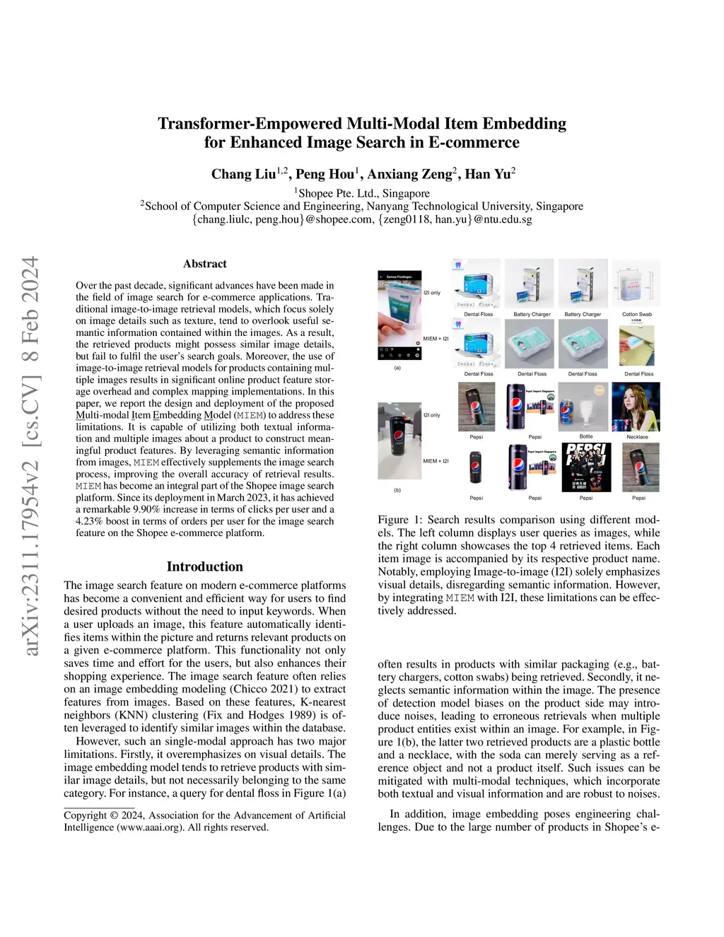 Over the past decade, significant advances have been made in the field of image search for e-commerce applications. Traditional image-to-image retrieval models, which focus solely on image details such as texture, tend to overlook useful semantic information contained within the images. As a result, the retrieved products might possess similar image details, but fail to fulfil the user's search goals. Moreover, the use of image-to-image retrieval models for products containing multiple images results in significant online product feature storage overhead and complex mapping implementations. In this paper, we report the design and deployment of the proposed Multi-modal Item Embedding Model (MIEM) to address these limitations. It is capable of utilizing both textual information and multiple images about a product to construct meaningful product features. By leveraging semantic information from images, MIEM effectively supplements the image search process, improving the overall accuracy of retrieval results. MIEM has become an integral part of the Shopee image search platform. Since its deployment in March 2023, it has achieved a remarkable 9.90% increase in terms of clicks per user and a 4.23% boost in terms of orders per user for the image search feature on the Shopee e-commerce platform.