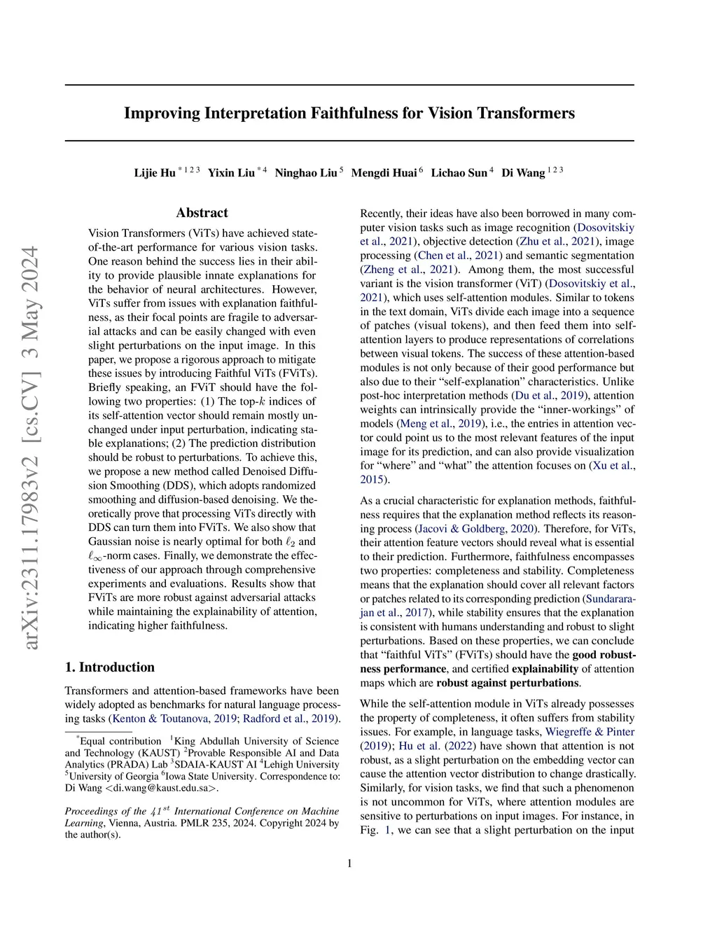 Vision Transformers (ViTs) have achieved state-of-the-art performance for various vision tasks. One reason behind the success lies in their ability to provide plausible innate explanations for the behavior of neural architectures. However, ViTs suffer from issues with explanation faithfulness, as their focal points are fragile to adversarial attacks and can be easily changed with even slight perturbations on the input image. In this paper, we propose a rigorous approach to mitigate these issues by introducing Faithful ViTs (FViTs). Briefly speaking, an FViT should have the following two properties: (1) The top- indices of its self-attention vector should remain mostly unchanged under input perturbation, indicating stable explanations; (2) The prediction distribution should be robust to perturbations. To achieve this, we propose a new method called Denoised Diffusion Smoothing (DDS), which adopts randomized smoothing and diffusion-based denoising. We theoretically prove that processing ViTs directly with DDS can turn them into FViTs. We also show that Gaussian noise is nearly optimal for both and -norm cases. Finally, we demonstrate the effectiveness of our approach through comprehensive experiments and evaluations. Results show that FViTs are more robust against adversarial attacks while maintaining the explainability of attention, indicating higher faithfulness.