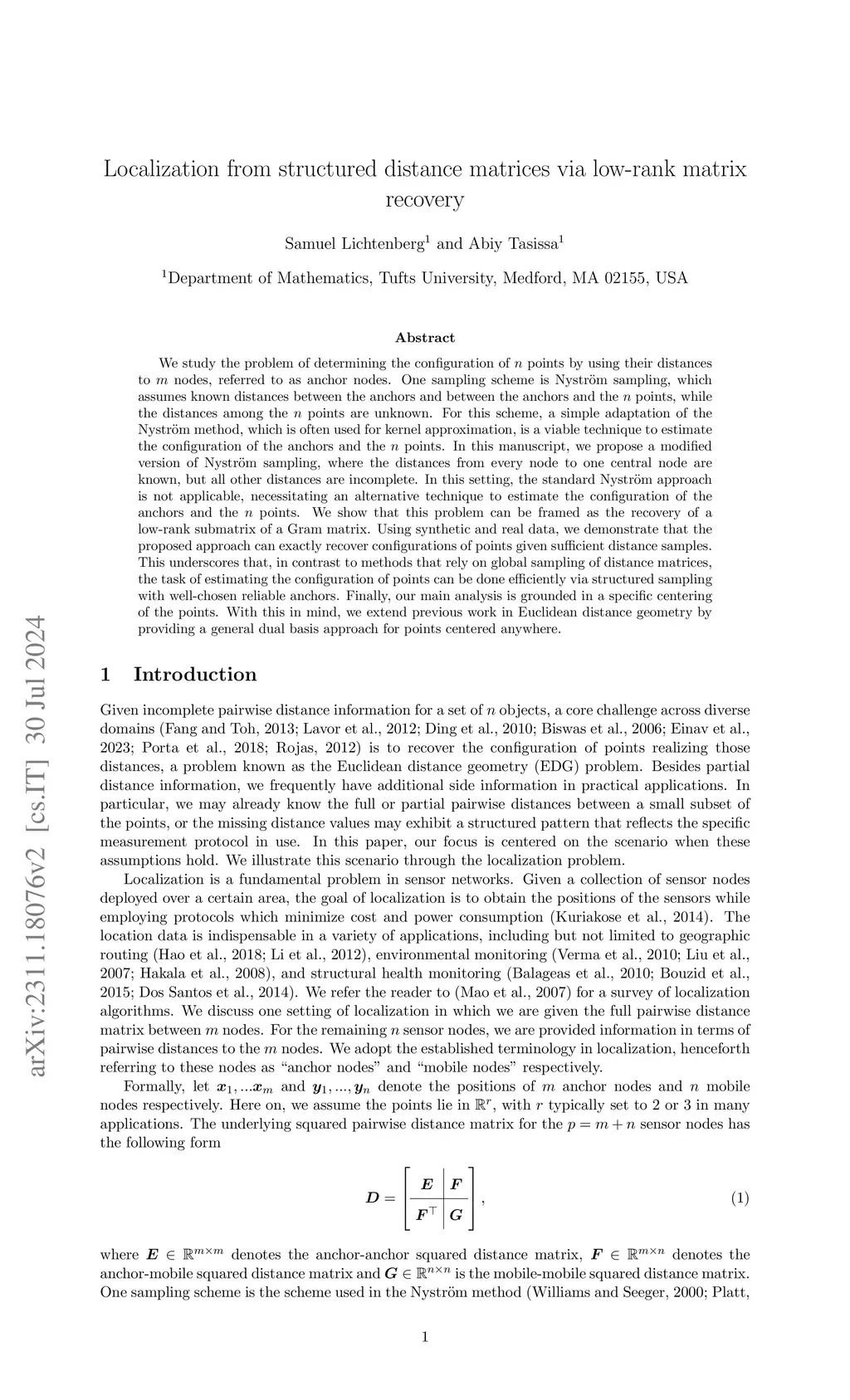 We study the problem of determining the configuration of points, referred to as mobile nodes, by utilizing pairwise distances to fixed points known as anchor nodes. In the standard setting, we have information about the distances between anchors (anchor-anchor) and between anchors and mobile nodes (anchor-mobile), but the distances between mobile nodes (mobile-mobile) are not known. For this setup, the Nystr\"om method is a viable technique for estimating the positions of the mobile nodes. This study focuses on the setting where the anchor-mobile block of the distance matrix contains only partial distance information. First, we establish a relationship between the columns of the anchor-mobile block in the distance matrix and the columns of the corresponding block in the Gram matrix via a graph Laplacian. Exploiting this connection, we introduce a novel sampling model that frames the position estimation problem as low-rank recovery of an inner product matrix, given a subset of its expansion coefficients in a special non-orthogonal basis. This basis and its dual basis--the central elements of our model--are explicitly derived. Our analysis is grounded in a specific centering of the points that is unique to the Nystr\"om method. With this in mind, we extend previous work in Euclidean distance geometry by providing a general dual basis approach for points centered anywhere.