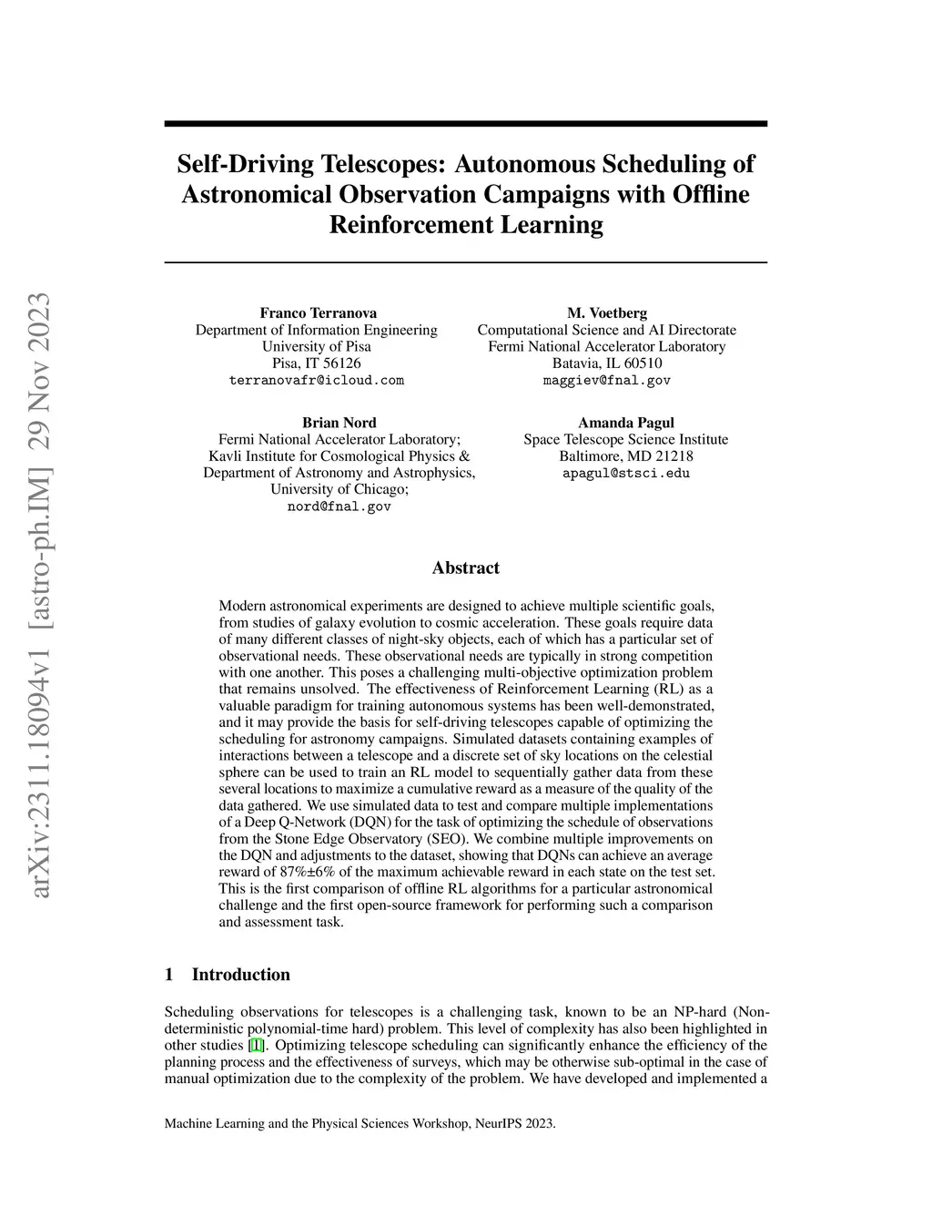 Modern astronomical experiments are designed to achieve multiple scientific goals, from studies of galaxy evolution to cosmic acceleration. These goals require data of many different classes of night-sky objects, each of which has a particular set of observational needs. These observational needs are typically in strong competition with one another. This poses a challenging multi-objective optimization problem that remains unsolved. The effectiveness of Reinforcement Learning (RL) as a valuable paradigm for training autonomous systems has been well-demonstrated, and it may provide the basis for self-driving telescopes capable of optimizing the scheduling for astronomy campaigns. Simulated datasets containing examples of interactions between a telescope and a discrete set of sky locations on the celestial sphere can be used to train an RL model to sequentially gather data from these several locations to maximize a cumulative reward as a measure of the quality of the data gathered. We use simulated data to test and compare multiple implementations of a Deep Q-Network (DQN) for the task of optimizing the schedule of observations from the Stone Edge Observatory (SEO). We combine multiple improvements on the DQN and adjustments to the dataset, showing that DQNs can achieve an average reward of 87%+-6% of the maximum achievable reward in each state on the test set. This is the first comparison of offline RL algorithms for a particular astronomical challenge and the first open-source framework for performing such a comparison and assessment task.
