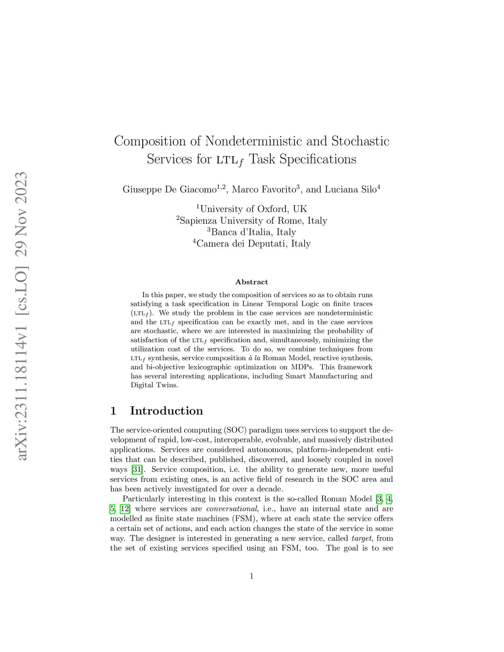 In this paper, we study the composition of services so as to obtain runs satisfying a task specification in Linear Temporal Logic on finite traces (LTLf). We study the problem in the case services are nondeterministic and the LTLf specification can be exactly met, and in the case services are stochastic, where we are interested in maximizing the probability of satisfaction of the LTLf specification and, simultaneously, minimizing the utilization cost of the services. To do so, we combine techniques from LTLf synthesis, service composition \`a la Roman Model, reactive synthesis, and bi-objective lexicographic optimization on MDPs. This framework has several interesting applications, including Smart Manufacturing and Digital Twins.