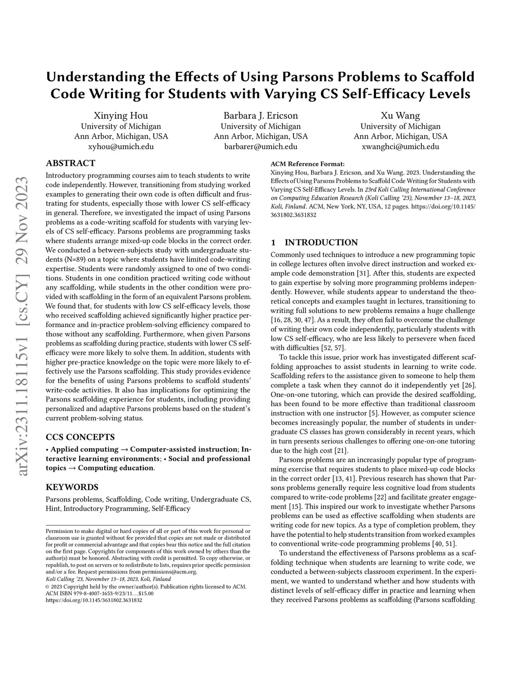 Understanding the Effects of Using Parsons Problems to Scaffold Code
