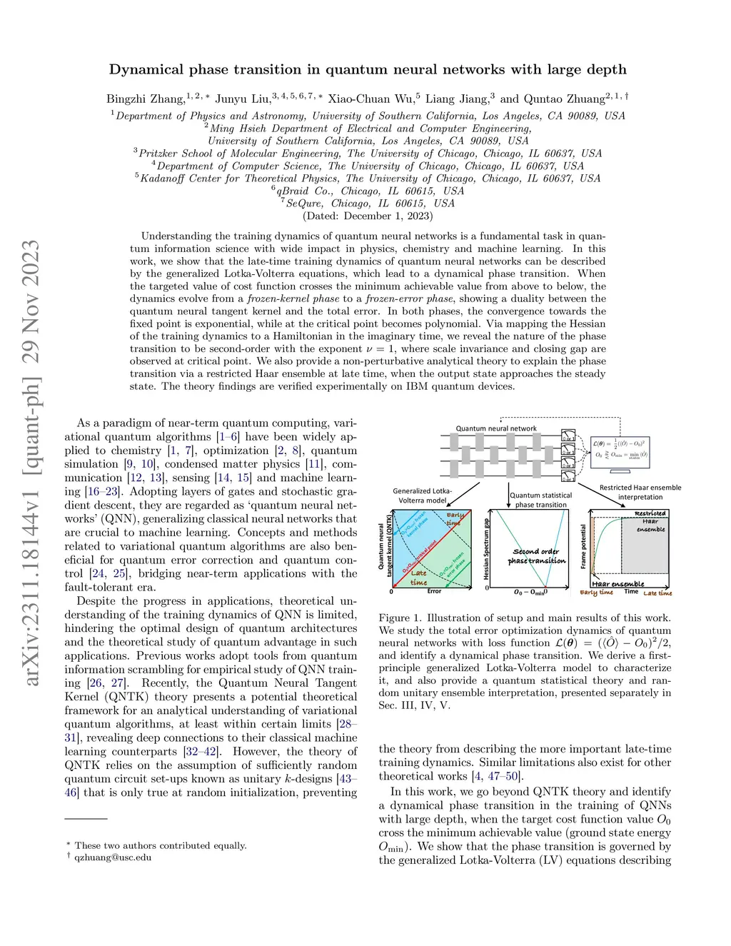 Understanding the training dynamics of quantum neural networks is a fundamental task in quantum information science with wide impact in physics, chemistry and machine learning. In this work, we show that the late-time training dynamics of quantum neural networks can be described by the generalized Lotka-Volterra equations, which lead to a dynamical phase transition. When the targeted value of cost function crosses the minimum achievable value from above to below, the dynamics evolve from a frozen-kernel phase to a frozen-error phase, showing a duality between the quantum neural tangent kernel and the total error. In both phases, the convergence towards the fixed point is exponential, while at the critical point becomes polynomial. Via mapping the Hessian of the training dynamics to a Hamiltonian in the imaginary time, we reveal the nature of the phase transition to be second-order with the exponent , where scale invariance and closing gap are observed at critical point. We also provide a non-perturbative analytical theory to explain the phase transition via a restricted Haar ensemble at late time, when the output state approaches the steady state. The theory findings are verified experimentally on IBM quantum devices.