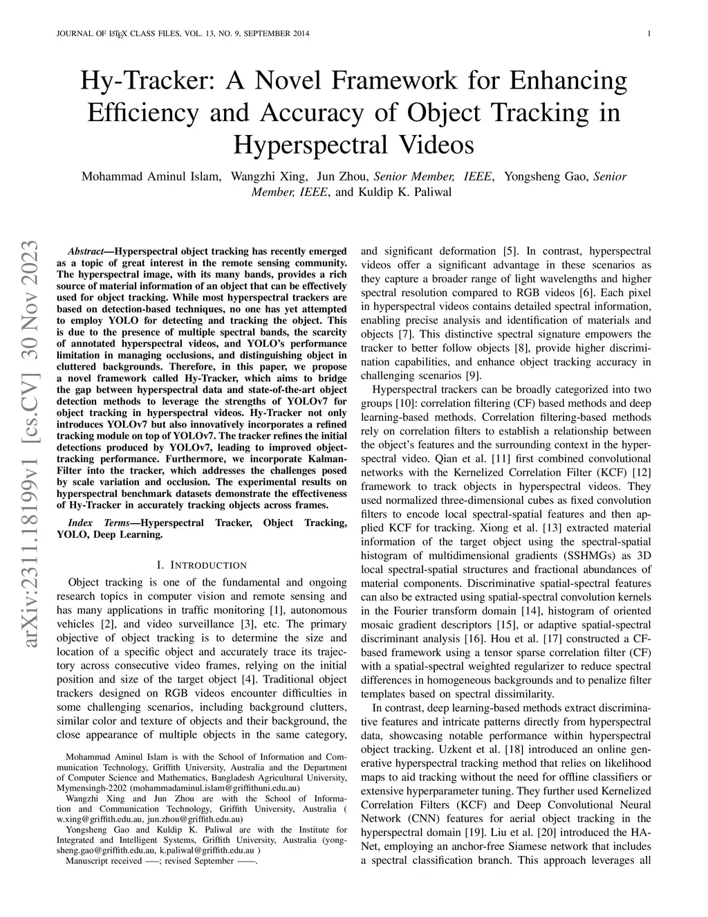 Hyperspectral object tracking has recently emerged as a topic of great interest in the remote sensing community. The hyperspectral image, with its many bands, provides a rich source of material information of an object that can be effectively used for object tracking. While most hyperspectral trackers are based on detection-based techniques, no one has yet attempted to employ YOLO for detecting and tracking the object. This is due to the presence of multiple spectral bands, the scarcity of annotated hyperspectral videos, and YOLO's performance limitation in managing occlusions, and distinguishing object in cluttered backgrounds. Therefore, in this paper, we propose a novel framework called Hy-Tracker, which aims to bridge the gap between hyperspectral data and state-of-the-art object detection methods to leverage the strengths of YOLOv7 for object tracking in hyperspectral videos. Hy-Tracker not only introduces YOLOv7 but also innovatively incorporates a refined tracking module on top of YOLOv7. The tracker refines the initial detections produced by YOLOv7, leading to improved object-tracking performance. Furthermore, we incorporate Kalman-Filter into the tracker, which addresses the challenges posed by scale variation and occlusion. The experimental results on hyperspectral benchmark datasets demonstrate the effectiveness of Hy-Tracker in accurately tracking objects across frames.
