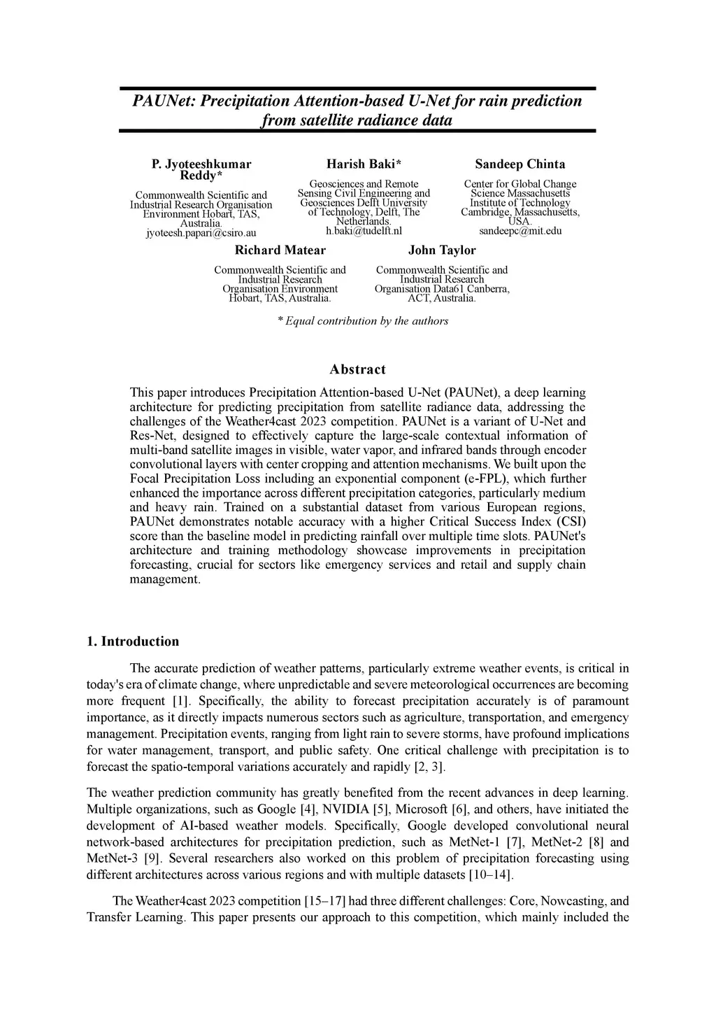 This paper introduces Precipitation Attention-based U-Net (PAUNet), a deep learning architecture for predicting precipitation from satellite radiance data, addressing the challenges of the Weather4cast 2023 competition. PAUNet is a variant of U-Net and Res-Net, designed to effectively capture the large-scale contextual information of multi-band satellite images in visible, water vapor, and infrared bands through encoder convolutional layers with center cropping and attention mechanisms. We built upon the Focal Precipitation Loss including an exponential component (e-FPL), which further enhanced the importance across different precipitation categories, particularly medium and heavy rain. Trained on a substantial dataset from various European regions, PAUNet demonstrates notable accuracy with a higher Critical Success Index (CSI) score than the baseline model in predicting rainfall over multiple time slots. PAUNet's architecture and training methodology showcase improvements in precipitation forecasting, crucial for sectors like emergency services and retail and supply chain management.