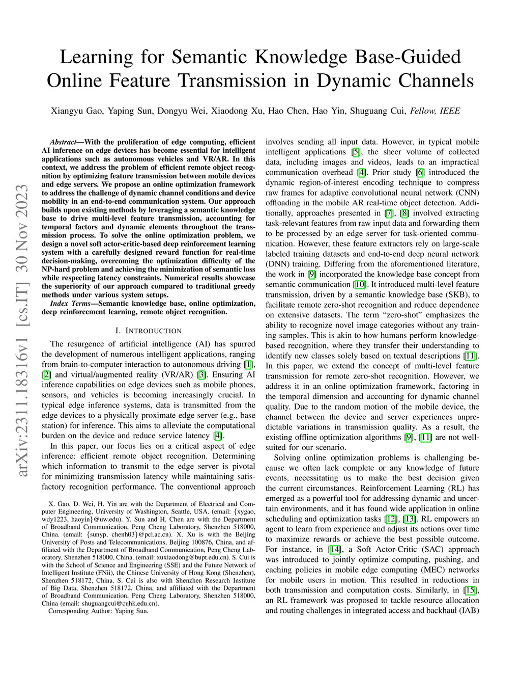 With the proliferation of edge computing, efficient AI inference on edge devices has become essential for intelligent applications such as autonomous vehicles and VR/AR. In this context, we address the problem of efficient remote object recognition by optimizing feature transmission between mobile devices and edge servers. We propose an online optimization framework to address the challenge of dynamic channel conditions and device mobility in an end-to-end communication system. Our approach builds upon existing methods by leveraging a semantic knowledge base to drive multi-level feature transmission, accounting for temporal factors and dynamic elements throughout the transmission process. To solve the online optimization problem, we design a novel soft actor-critic-based deep reinforcement learning system with a carefully designed reward function for real-time decision-making, overcoming the optimization difficulty of the NP-hard problem and achieving the minimization of semantic loss while respecting latency constraints. Numerical results showcase the superiority of our approach compared to traditional greedy methods under various system setups.