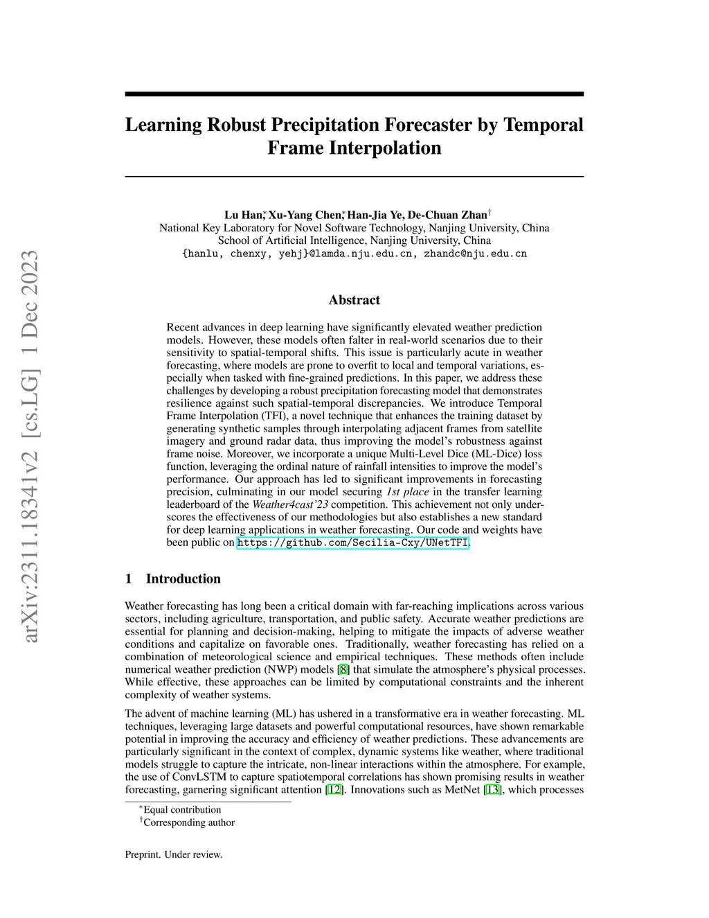 Recent advances in deep learning have significantly elevated weather prediction models. However, these models often falter in real-world scenarios due to their sensitivity to spatial-temporal shifts. This issue is particularly acute in weather forecasting, where models are prone to overfit to local and temporal variations, especially when tasked with fine-grained predictions. In this paper, we address these challenges by developing a robust precipitation forecasting model that demonstrates resilience against such spatial-temporal discrepancies. We introduce Temporal Frame Interpolation (TFI), a novel technique that enhances the training dataset by generating synthetic samples through interpolating adjacent frames from satellite imagery and ground radar data, thus improving the model's robustness against frame noise. Moreover, we incorporate a unique Multi-Level Dice (ML-Dice) loss function, leveraging the ordinal nature of rainfall intensities to improve the model's performance. Our approach has led to significant improvements in forecasting precision, culminating in our model securing \textit{1st place} in the transfer learning leaderboard of the \textit{Weather4cast'23} competition. This achievement not only underscores the effectiveness of our methodologies but also establishes a new standard for deep learning applications in weather forecasting. Our code and weights have been public on \url{https://github.com/Secilia-Cxy/UNetTFI}.