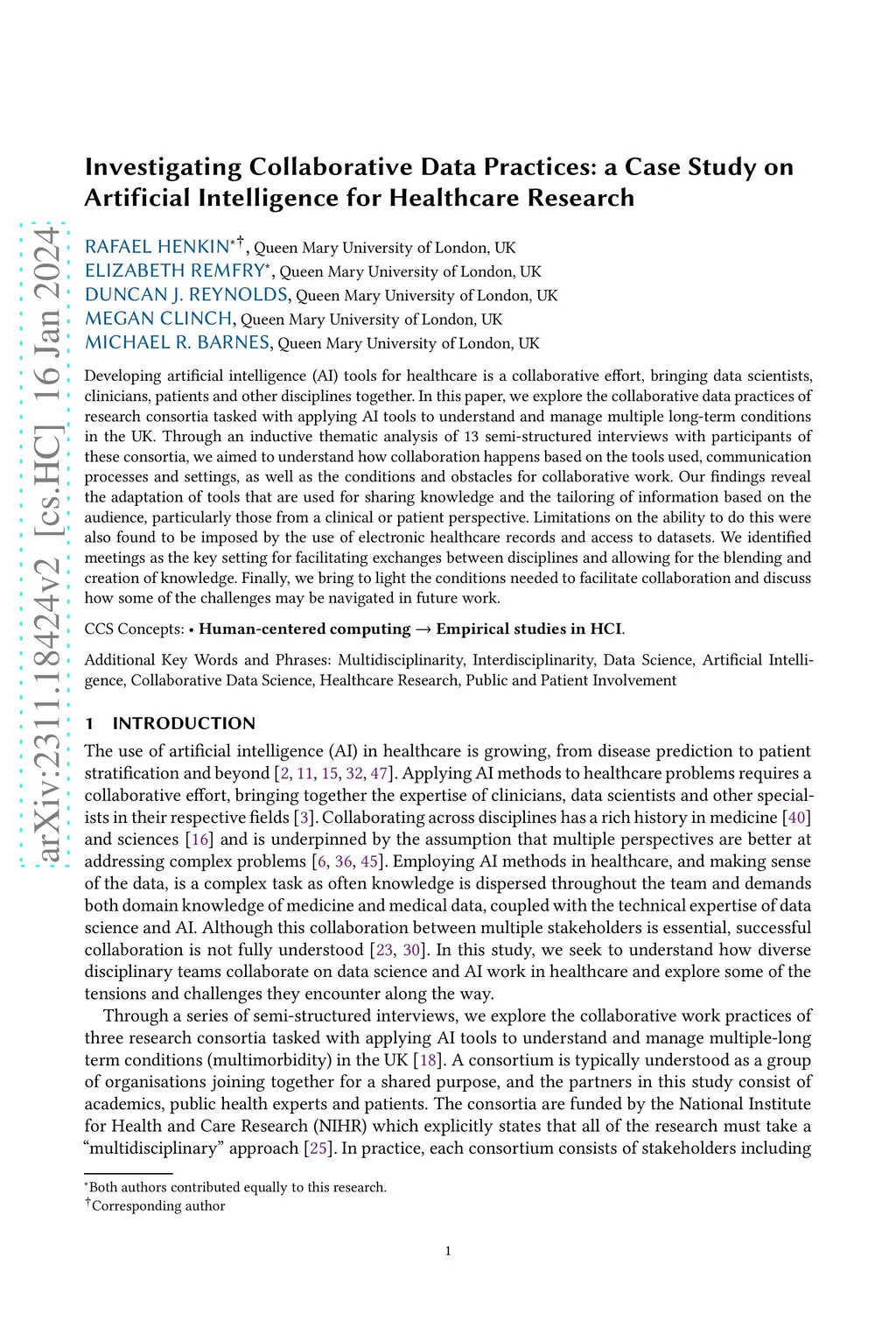 Developing artificial intelligence (AI) tools for healthcare is a collaborative effort, bringing data scientists, clinicians, patients and other disciplines together. In this paper, we explore the collaborative data practices of research consortia tasked with applying AI tools to understand and manage multiple long-term conditions in the UK. Through an inductive thematic analysis of 13 semi-structured interviews with participants of these consortia, we aimed to understand how collaboration happens based on the tools used, communication processes and settings, as well as the conditions and obstacles for collaborative work. Our findings reveal the adaptation of tools that are used for sharing knowledge and the tailoring of information based on the audience, particularly those from a clinical or patient perspective. Limitations on the ability to do this were also found to be imposed by the use of electronic healthcare records and access to datasets. We identified meetings as the key setting for facilitating exchanges between disciplines and allowing for the blending and creation of knowledge. Finally, we bring to light the conditions needed to facilitate collaboration and discuss how some of the challenges may be navigated in future work.