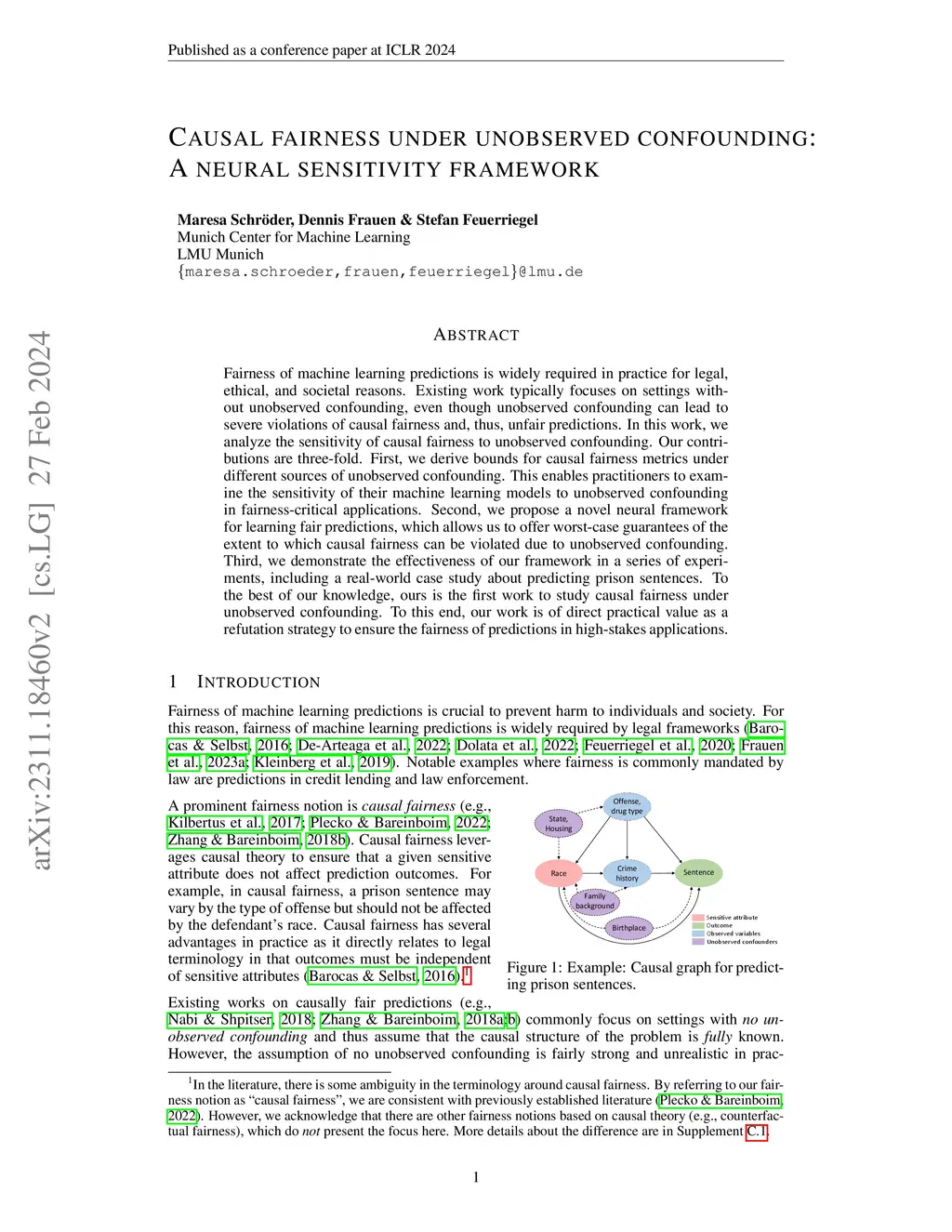 Fairness for machine learning predictions is widely required in practice for legal, ethical, and societal reasons. Existing work typically focuses on settings without unobserved confounding, even though unobserved confounding can lead to severe violations of causal fairness and, thus, unfair predictions. In this work, we analyze the sensitivity of causal fairness to unobserved confounding. Our contributions are three-fold. First, we derive bounds for causal fairness metrics under different sources of unobserved confounding. This enables practitioners to examine the sensitivity of their machine learning models to unobserved confounding in fairness-critical applications. Second, we propose a novel neural framework for learning fair predictions, which allows us to offer worst-case guarantees of the extent to which causal fairness can be violated due to unobserved confounding. Third, we demonstrate the effectiveness of our framework in a series of experiments, including a real-world case study about predicting prison sentences. To the best of our knowledge, ours is the first work to study causal fairness under unobserved confounding. To this end, our work is of direct practical value as a refutation strategy to ensure the fairness of predictions in high-stakes applications.
