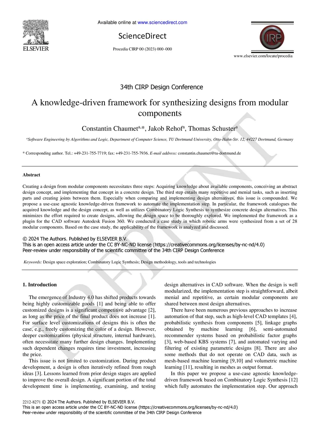 Creating a design from modular components necessitates three steps: Acquiring knowledge about available components, conceiving an abstract design concept, and implementing that concept in a concrete design. The third step entails many repetitive and menial tasks, such as inserting parts and creating joints between them. Especially when comparing and implementing design alternatives, this issue is compounded. We propose a use-case agnostic knowledge-driven framework to automate the implementation step. In particular, the framework catalogues the acquired knowledge and the design concept, as well as utilizes Combinatory Logic Synthesis to synthesize concrete design alternatives. This minimizes the effort required to create designs, allowing the design space to be thoroughly explored. We implemented the framework as a plugin for the CAD software Autodesk Fusion 360. We conducted a case study in which robotic arms were synthesized from a set of 28 modular components. Based on the case study, the applicability of the framework is analyzed and discussed.