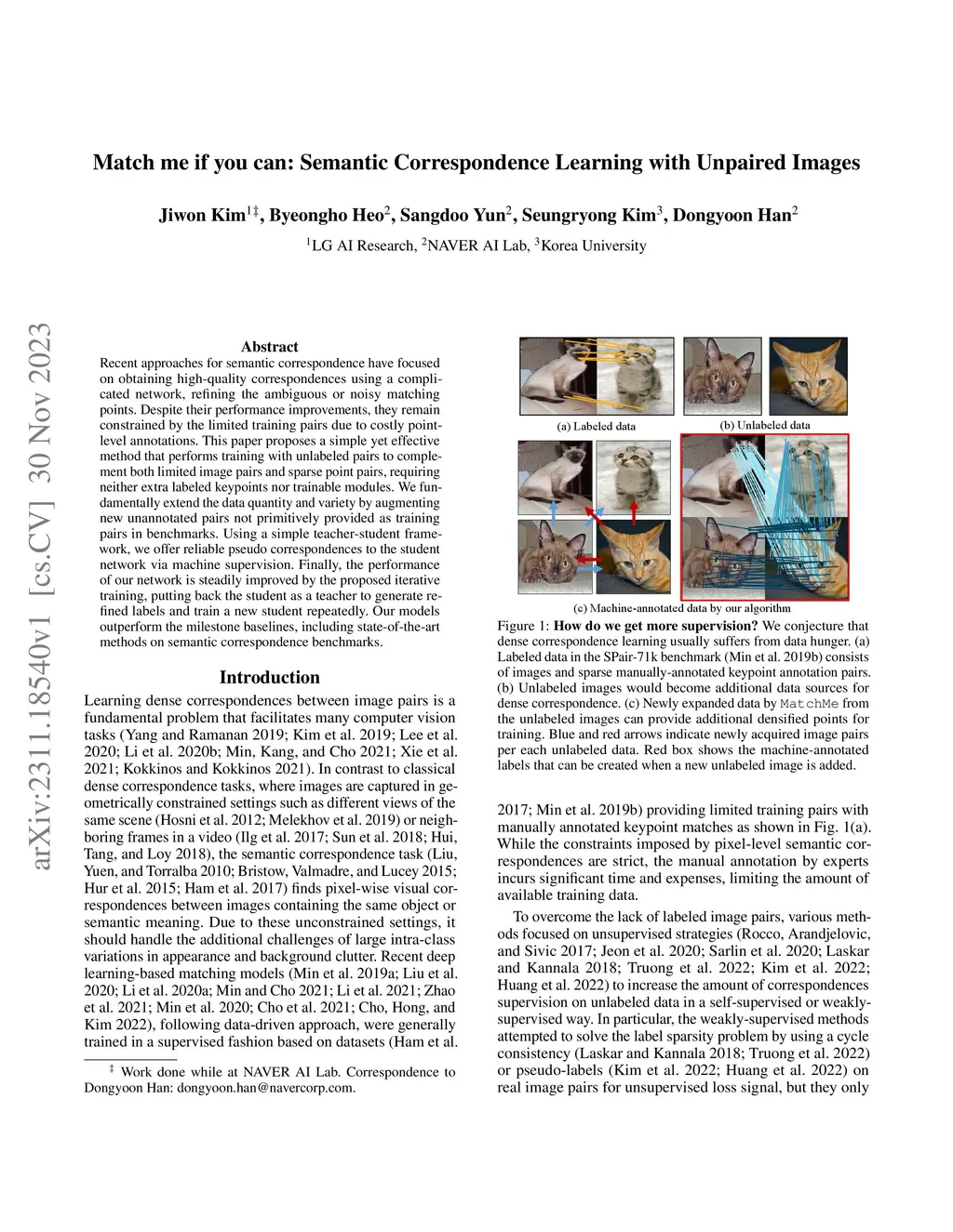 Recent approaches for semantic correspondence have focused on obtaining high-quality correspondences using a complicated network, refining the ambiguous or noisy matching points. Despite their performance improvements, they remain constrained by the limited training pairs due to costly point-level annotations. This paper proposes a simple yet effective method that performs training with unlabeled pairs to complement both limited image pairs and sparse point pairs, requiring neither extra labeled keypoints nor trainable modules. We fundamentally extend the data quantity and variety by augmenting new unannotated pairs not primitively provided as training pairs in benchmarks. Using a simple teacher-student framework, we offer reliable pseudo correspondences to the student network via machine supervision. Finally, the performance of our network is steadily improved by the proposed iterative training, putting back the student as a teacher to generate refined labels and train a new student repeatedly. Our models outperform the milestone baselines, including state-of-the-art methods on semantic correspondence benchmarks.