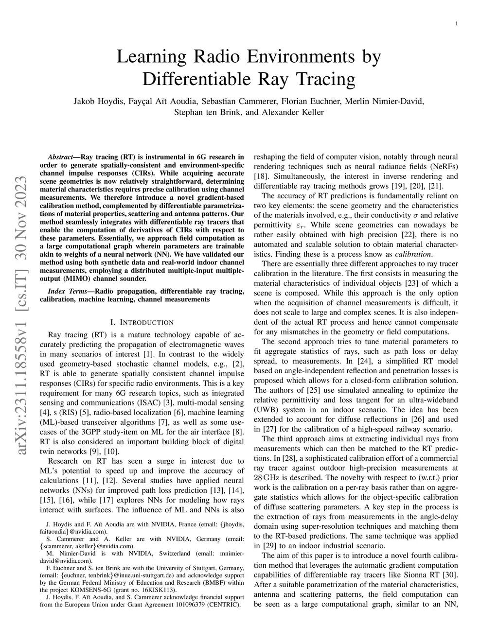 Ray tracing (RT) is instrumental in 6G research in order to generate spatially-consistent and environment-specific channel impulse responses (CIRs). While acquiring accurate scene geometries is now relatively straightforward, determining material characteristics requires precise calibration using channel measurements. We therefore introduce a novel gradient-based calibration method, complemented by differentiable parametrizations of material properties, scattering and antenna patterns. Our method seamlessly integrates with differentiable ray tracers that enable the computation of derivatives of CIRs with respect to these parameters. Essentially, we approach field computation as a large computational graph wherein parameters are trainable akin to weights of a neural network (NN). We have validated our method using both synthetic data and real-world indoor channel measurements, employing a distributed multiple-input multiple-output (MIMO) channel sounder.