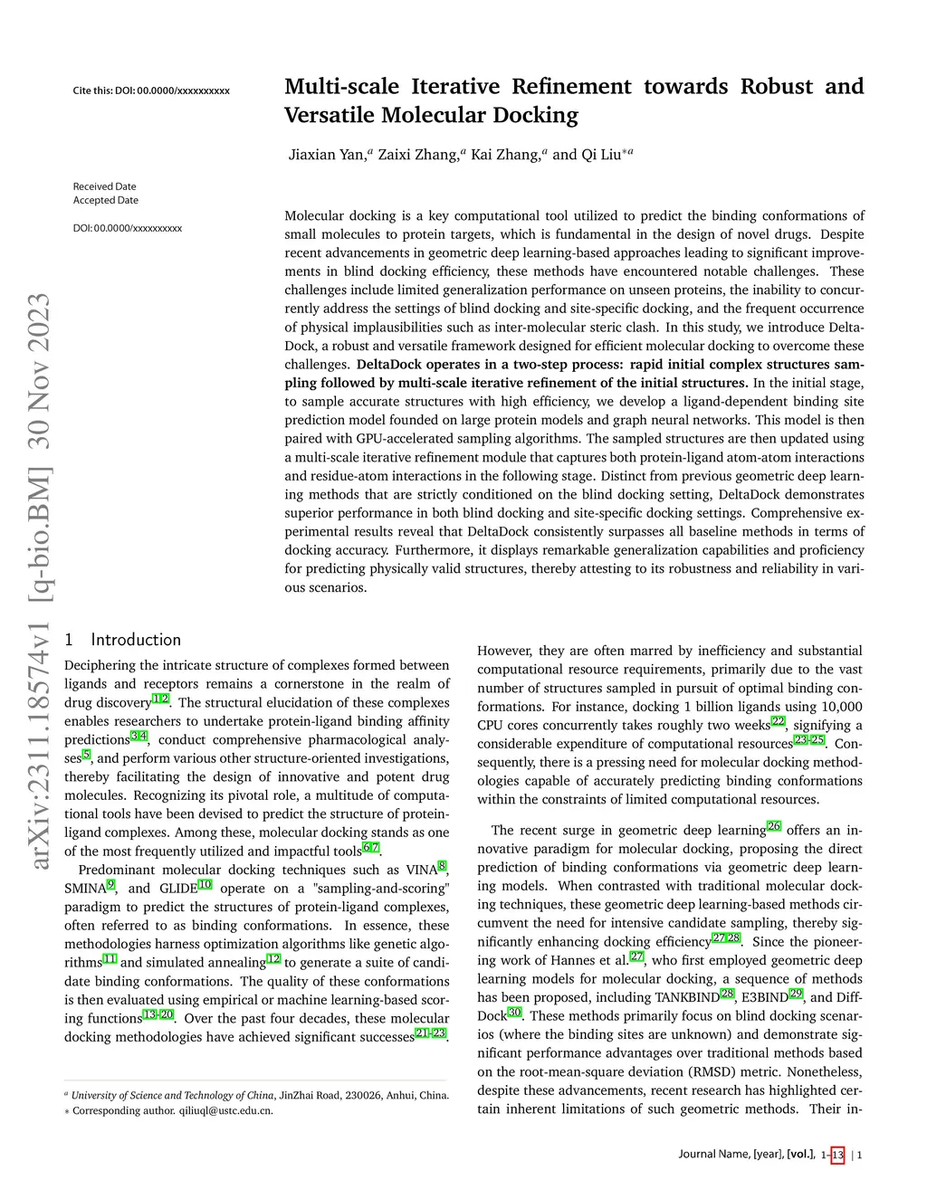 Molecular docking is a key computational tool utilized to predict the binding conformations of small molecules to protein targets, which is fundamental in the design of novel drugs. Despite recent advancements in geometric deep learning-based approaches leading to improvements in blind docking efficiency, these methods have encountered notable challenges, such as limited generalization performance on unseen proteins, the inability to concurrently address the settings of blind docking and site-specific docking, and the frequent occurrence of physical implausibilities such as inter-molecular steric clash. In this study, we introduce DeltaDock, a robust and versatile framework designed for efficient molecular docking to overcome these challenges. DeltaDock operates in a two-step process: rapid initial complex structures sampling followed by multi-scale iterative refinement of the initial structures. In the initial stage, to sample accurate structures with high efficiency, we develop a ligand-dependent binding site prediction model founded on large protein models and graph neural networks. This model is then paired with GPU-accelerated sampling algorithms. The sampled structures are updated using a multi-scale iterative refinement module that captures both protein-ligand atom-atom interactions and residue-atom interactions in the following stage. Distinct from previous geometric deep learning methods that are conditioned on the blind docking setting, DeltaDock demonstrates superior performance in both blind docking and site-specific docking settings. Comprehensive experimental results reveal that DeltaDock consistently surpasses baseline methods in terms of docking accuracy. Furthermore, it displays remarkable generalization capabilities and proficiency for predicting physically valid structures, thereby attesting to its robustness and reliability in various scenarios.