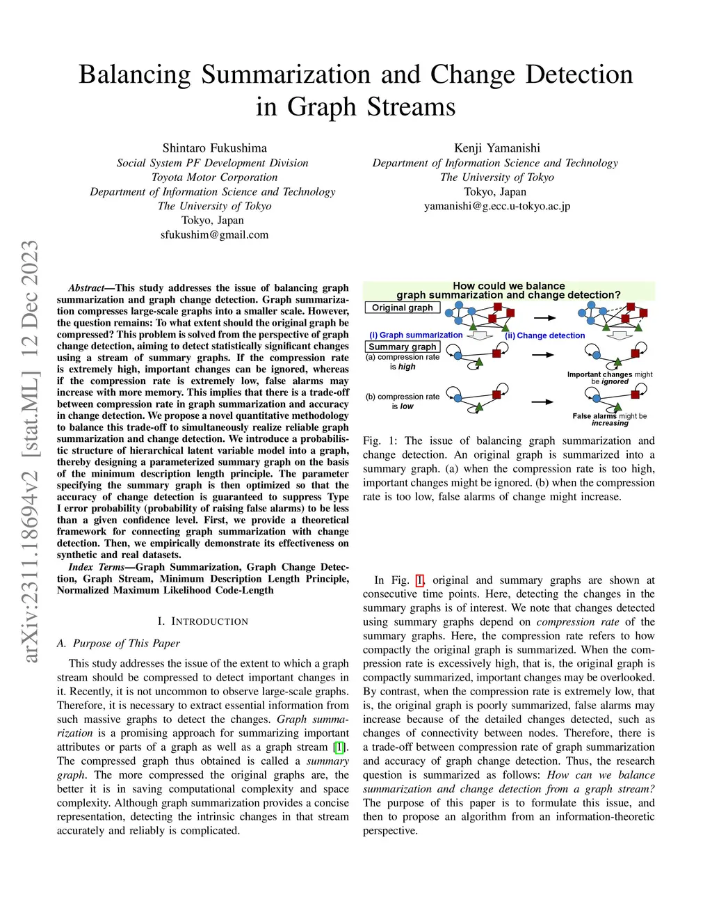 This study addresses the issue of balancing graph summarization and graph change detection. Graph summarization compresses large-scale graphs into a smaller scale. However, the question remains: To what extent should the original graph be compressed? This problem is solved from the perspective of graph change detection, aiming to detect statistically significant changes using a stream of summary graphs. If the compression rate is extremely high, important changes can be ignored, whereas if the compression rate is extremely low, false alarms may increase with more memory. This implies that there is a trade-off between compression rate in graph summarization and accuracy in change detection. We propose a novel quantitative methodology to balance this trade-off to simultaneously realize reliable graph summarization and change detection. We introduce a probabilistic structure of hierarchical latent variable model into a graph, thereby designing a parameterized summary graph on the basis of the minimum description length principle. The parameter specifying the summary graph is then optimized so that the accuracy of change detection is guaranteed to suppress Type I error probability (probability of raising false alarms) to be less than a given confidence level. First, we provide a theoretical framework for connecting graph summarization with change detection. Then, we empirically demonstrate its effectiveness on synthetic and real datasets.