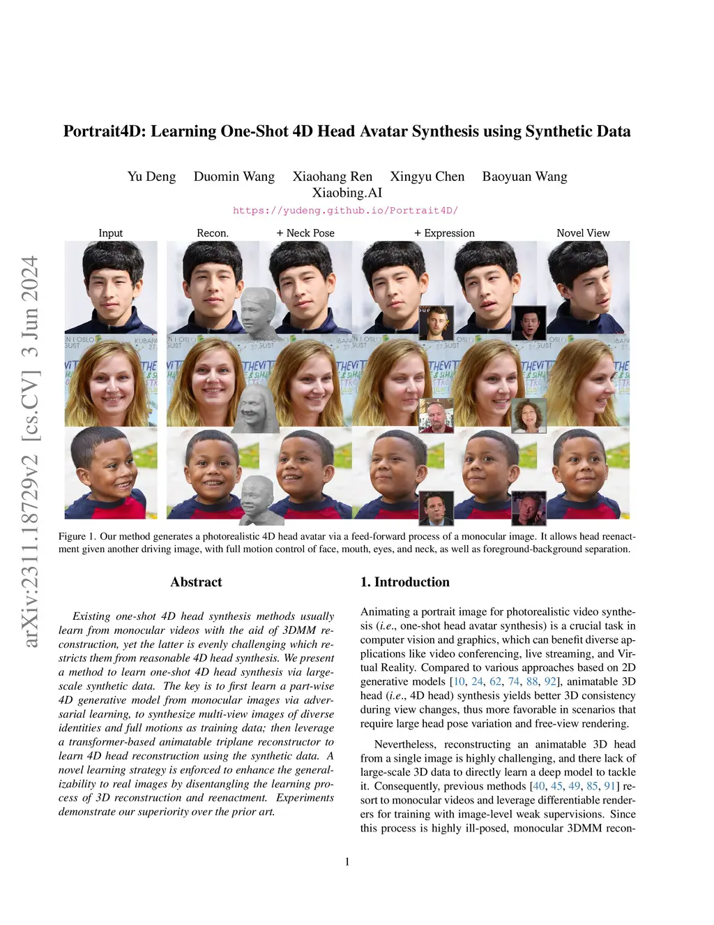 Existing one-shot 4D head synthesis methods usually learn from monocular videos with the aid of 3DMM reconstruction, yet the latter is evenly challenging which restricts them from reasonable 4D head synthesis. We present a method to learn one-shot 4D head synthesis via large-scale synthetic data. The key is to first learn a part-wise 4D generative model from monocular images via adversarial learning, to synthesize multi-view images of diverse identities and full motions as training data; then leverage a transformer-based animatable triplane reconstructor to learn 4D head reconstruction using the synthetic data. A novel learning strategy is enforced to enhance the generalizability to real images by disentangling the learning process of 3D reconstruction and reenactment. Experiments demonstrate our superiority over the prior art.