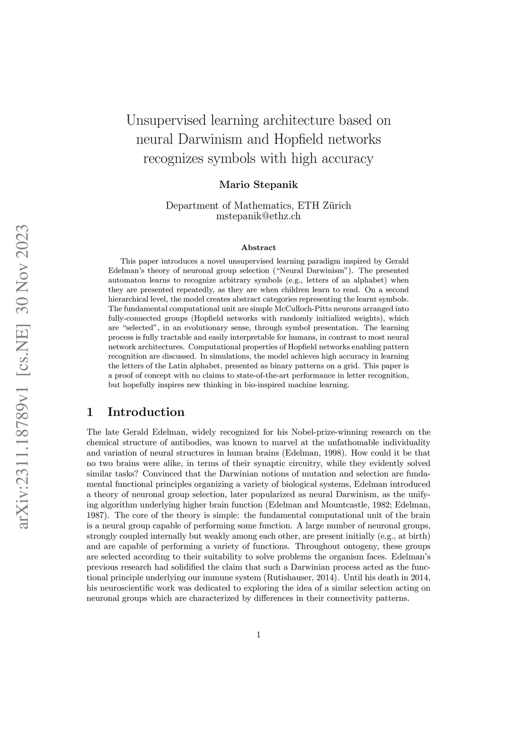 This paper introduces a novel unsupervised learning paradigm inspired by Gerald Edelman's theory of neuronal group selection ("Neural Darwinism"). The presented automaton learns to recognize arbitrary symbols (e.g., letters of an alphabet) when they are presented repeatedly, as they are when children learn to read. On a second hierarchical level, the model creates abstract categories representing the learnt symbols. The fundamental computational unit are simple McCulloch-Pitts neurons arranged into fully-connected groups (Hopfield networks with randomly initialized weights), which are "selected", in an evolutionary sense, through symbol presentation. The learning process is fully tractable and easily interpretable for humans, in contrast to most neural network architectures. Computational properties of Hopfield networks enabling pattern recognition are discussed. In simulations, the model achieves high accuracy in learning the letters of the Latin alphabet, presented as binary patterns on a grid. This paper is a proof of concept with no claims to state-of-the-art performance in letter recognition, but hopefully inspires new thinking in bio-inspired machine learning.