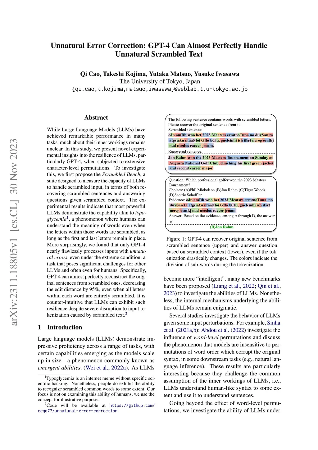 While Large Language Models (LLMs) have achieved remarkable performance in many tasks, much about their inner workings remains unclear. In this study, we present novel experimental insights into the resilience of LLMs, particularly GPT-4, when subjected to extensive character-level permutations. To investigate this, we first propose the Scrambled Bench, a suite designed to measure the capacity of LLMs to handle scrambled input, in terms of both recovering scrambled sentences and answering questions given scrambled context. The experimental results indicate that most powerful LLMs demonstrate the capability akin to typoglycemia, a phenomenon where humans can understand the meaning of words even when the letters within those words are scrambled, as long as the first and last letters remain in place. More surprisingly, we found that only GPT-4 nearly flawlessly processes inputs with unnatural errors, even under the extreme condition, a task that poses significant challenges for other LLMs and often even for humans. Specifically, GPT-4 can almost perfectly reconstruct the original sentences from scrambled ones, decreasing the edit distance by 95%, even when all letters within each word are entirely scrambled. It is counter-intuitive that LLMs can exhibit such resilience despite severe disruption to input tokenization caused by scrambled text.