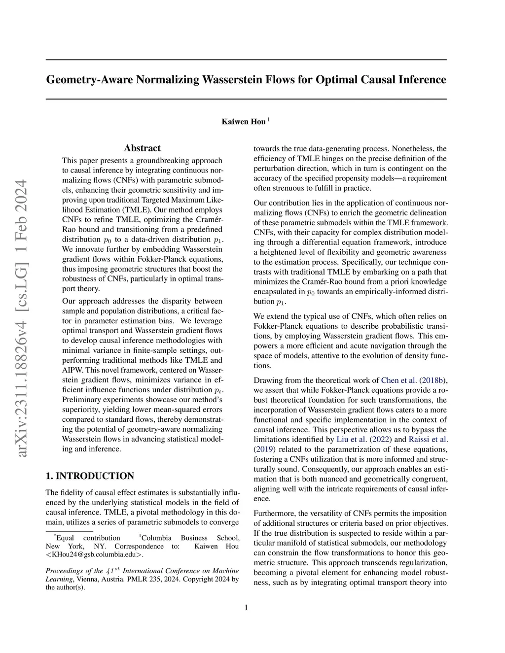 This paper presents a groundbreaking approach to causal inference by integrating continuous normalizing flows (CNFs) with parametric submodels, enhancing their geometric sensitivity and improving upon traditional Targeted Maximum Likelihood Estimation (TMLE). Our method employs CNFs to refine TMLE, optimizing the Cram\ér-Rao bound and transitioning from a predefined distribution to a data-driven distribution . We innovate further by embedding Wasserstein gradient flows within Fokker-Planck equations, thus imposing geometric structures that boost the robustness of CNFs, particularly in optimal transport theory. Our approach addresses the disparity between sample and population distributions, a critical factor in parameter estimation bias. We leverage optimal transport and Wasserstein gradient flows to develop causal inference methodologies with minimal variance in finite-sample settings, outperforming traditional methods like TMLE and AIPW. This novel framework, centered on Wasserstein gradient flows, minimizes variance in efficient influence functions under distribution . Preliminary experiments showcase our method's superiority, yielding lower mean-squared errors compared to standard flows, thereby demonstrating the potential of geometry-aware normalizing Wasserstein flows in advancing statistical modeling and inference.