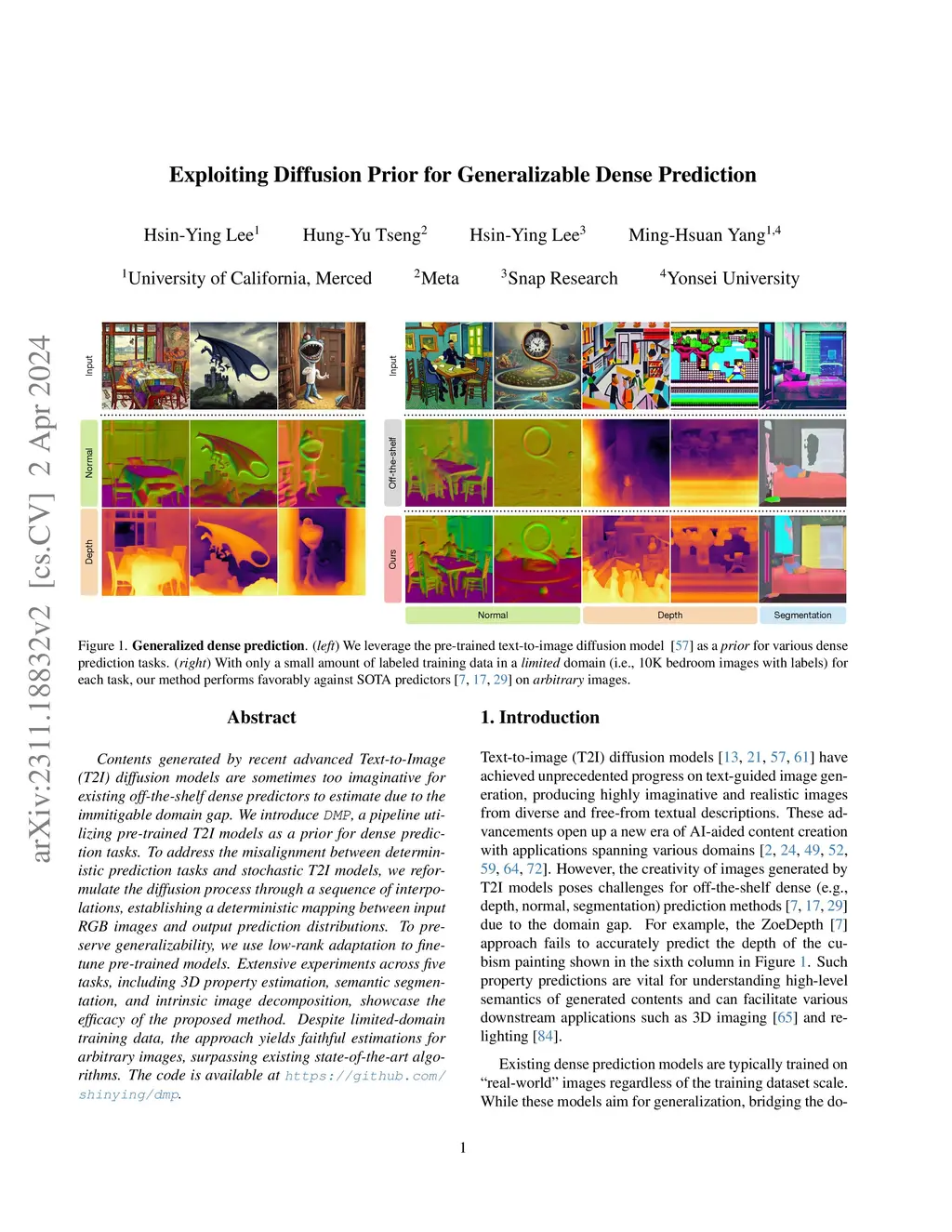 Contents generated by recent advanced Text-to-Image (T2I) diffusion models are sometimes too imaginative for existing off-the-shelf dense predictors to estimate due to the immitigable domain gap. We introduce DMP, a pipeline utilizing pre-trained T2I models as a prior for dense prediction tasks. To address the misalignment between deterministic prediction tasks and stochastic T2I models, we reformulate the diffusion process through a sequence of interpolations, establishing a deterministic mapping between input RGB images and output prediction distributions. To preserve generalizability, we use low-rank adaptation to fine-tune pre-trained models. Extensive experiments across five tasks, including 3D property estimation, semantic segmentation, and intrinsic image decomposition, showcase the efficacy of the proposed method. Despite limited-domain training data, the approach yields faithful estimations for arbitrary images, surpassing existing state-of-the-art algorithms.