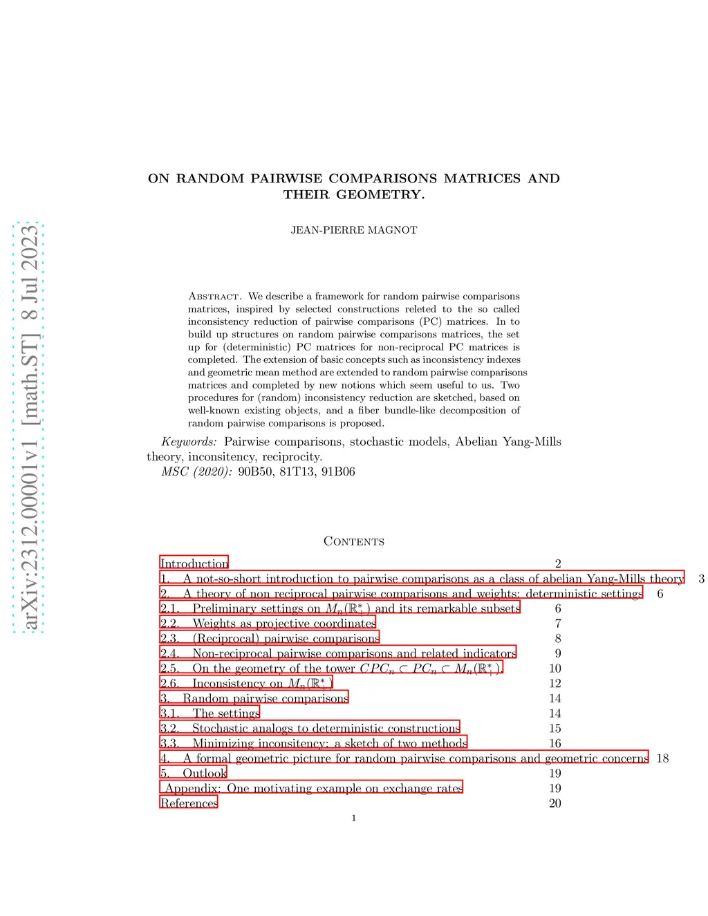 We describe a framework for random pairwise comparisons matrices, inspired by selected constructions releted to the so called inconsistency reduction of pairwise comparisons (PC) matrices. In to build up structures on random pairwise comparisons matrices, the set up for (deterministic) PC matrices for non-reciprocal PC matrices is completed. The extension of basic concepts such as inconsistency indexes and geometric mean method are extended to random pairwise comparisons matrices and completed by new notions which seem useful to us. Two procedures for (random) inconsistency reduction are sketched, based on well-known existing objects, and a fiber bundle-like decomposition of random pairwise comparisons is proposed.