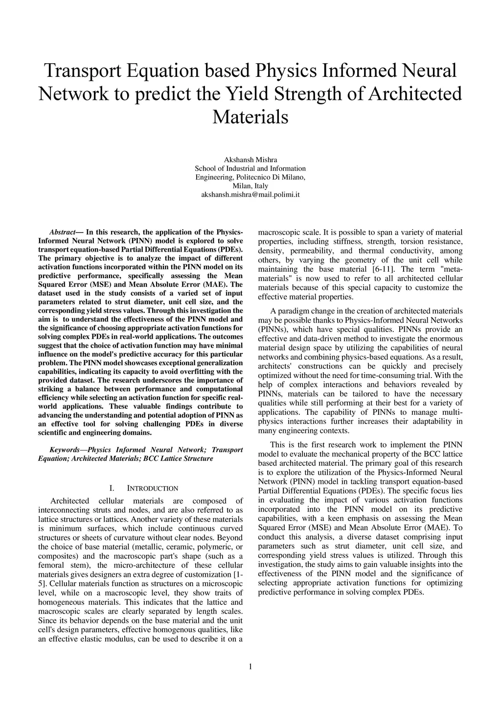 In this research, the application of the Physics-Informed Neural Network (PINN) model is explored to solve transport equation-based Partial Differential Equations (PDEs). The primary objective is to analyze the impact of different activation functions incorporated within the PINN model on its predictive performance, specifically assessing the Mean Squared Error (MSE) and Mean Absolute Error (MAE). The dataset used in the study consists of a varied set of input parameters related to strut diameter, unit cell size, and the corresponding yield stress values. Through this investigation the aim is to understand the effectiveness of the PINN model and the significance of choosing appropriate activation functions for solving complex PDEs in real-world applications. The outcomes suggest that the choice of activation function may have minimal influence on the model's predictive accuracy for this particular problem. The PINN model showcases exceptional generalization capabilities, indicating its capacity to avoid overfitting with the provided dataset. The research underscores the importance of striking a balance between performance and computational efficiency while selecting an activation function for specific real-world applications. These valuable findings contribute to advancing the understanding and potential adoption of PINN as an effective tool for solving challenging PDEs in diverse scientific and engineering domains.
