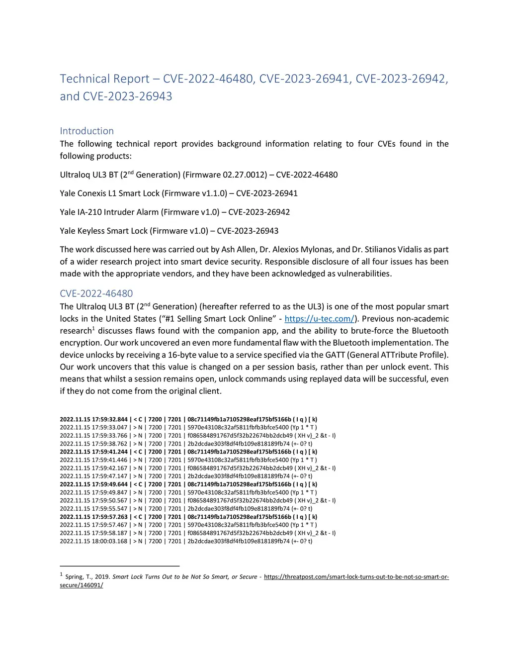 The following technical report provides background information relating to four CVEs found in the following products: Ultraloq UL3 BT (CVE-2022-46480); Yale Conexis L1 Smart Lock (CVE-2023-26941); Yale IA-210 Intruder Alarm (CVE-2023-26942); Yale Keyless Smart Lock (CVE-2023-26943). The work discussed here was carried out by Ash Allen, Dr. Alexios Mylonas, and Dr. Stilianos Vidalis as part of a wider research project into smart device security. Responsible disclosure of all four issues has been made with the appropriate vendors, and they have been acknowledged as vulnerabilities.