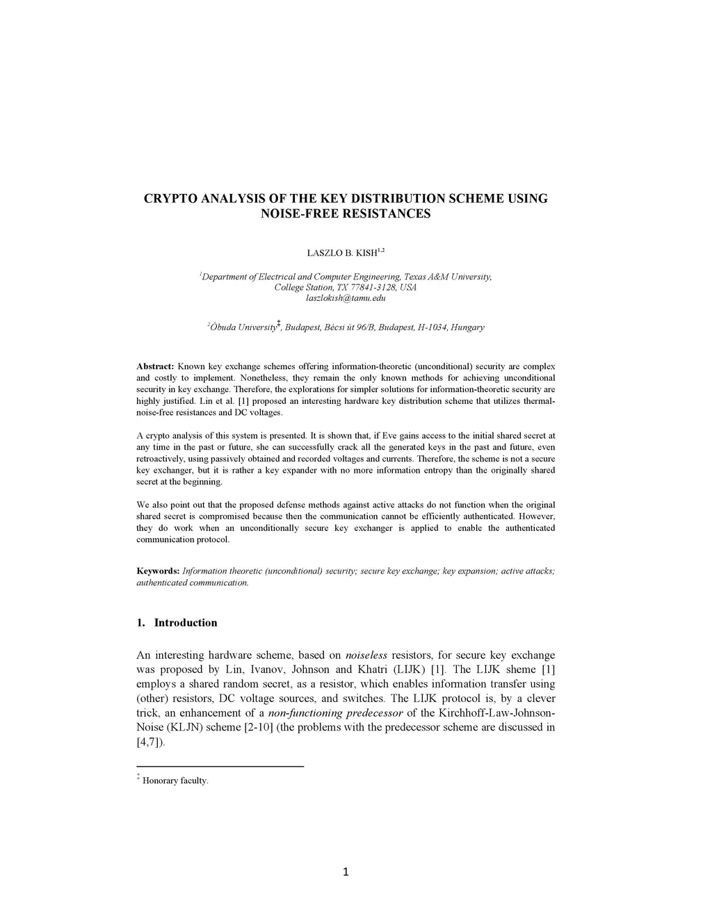 Known key exchange schemes offering information-theoretic (unconditional) security are complex and costly to implement. Nonetheless, they remain the only known methods for achieving unconditional security in key exchange. Therefore, the explorations for simpler solutions for information-theoretic security are highly justified. Lin et al. [1] proposed an interesting hardware key distribution scheme that utilizes thermal-noise-free resistances and DC voltages. A crypto analysis of this system is presented. It is shown that, if Eve gains access to the initial shared secret at any time in the past or future, she can successfully crack all the generated keys in the past and future, even retroactively, using passively obtained and recorded voltages and currents. Therefore, the scheme is not a secure key exchanger, but it is rather a key expander with no more information entropy than the originally shared secret at the beginning. We also point out that the proposed defense methods against active attacks do not function when the original shared secret is compromised because then the communication cannot be efficiently authenticated. However, they do work when an unconditionally secure key exchanger is applied to enable the authenticated communication protocol.