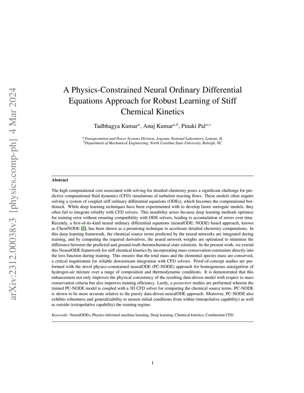 The high computational cost associated with solving for detailed chemistry poses a significant challenge for predictive computational fluid dynamics (CFD) simulations of turbulent reacting flows. These models often require solving a system of coupled stiff ordinary differential equations (ODEs). While deep learning techniques have been experimented with to develop faster surrogate models, they often fail to integrate reliably with CFD solvers. This instability arises because deep learning methods optimize for training error without ensuring compatibility with ODE solvers, leading to accumulation of errors over time. Recently, NeuralODE-based techniques have offered a promising solution by effectively modeling chemical kinetics. In this study, we extend the NeuralODE framework for stiff chemical kinetics by incorporating mass conservation constraints directly into the loss function during training. This ensures that the total mass and the elemental mass are conserved, a critical requirement for reliable downstream integration with CFD solvers. Proof-of-concept studies are performed with physics-constrained neuralODE (PC-NODE) approach for homogeneous autoignition of hydrogen-air mixture over a range of composition and thermodynamic conditions. Our results demonstrate that this enhancement not only improves the physical consistency with respect to mass conservation criteria but also ensures better robustness. Lastly, a posteriori studies are performed wherein the trained PC-NODE model is coupled with a 3D CFD solver for computing the chemical source terms. PC-NODE is shown to be more accurate relative to the purely data-driven neuralODE approach. Moreover, PC-NODE also exhibits robustness and generalizability to unseen initial conditions from within (interpolative capability) as well as outside (extrapolative capability) the training regime.