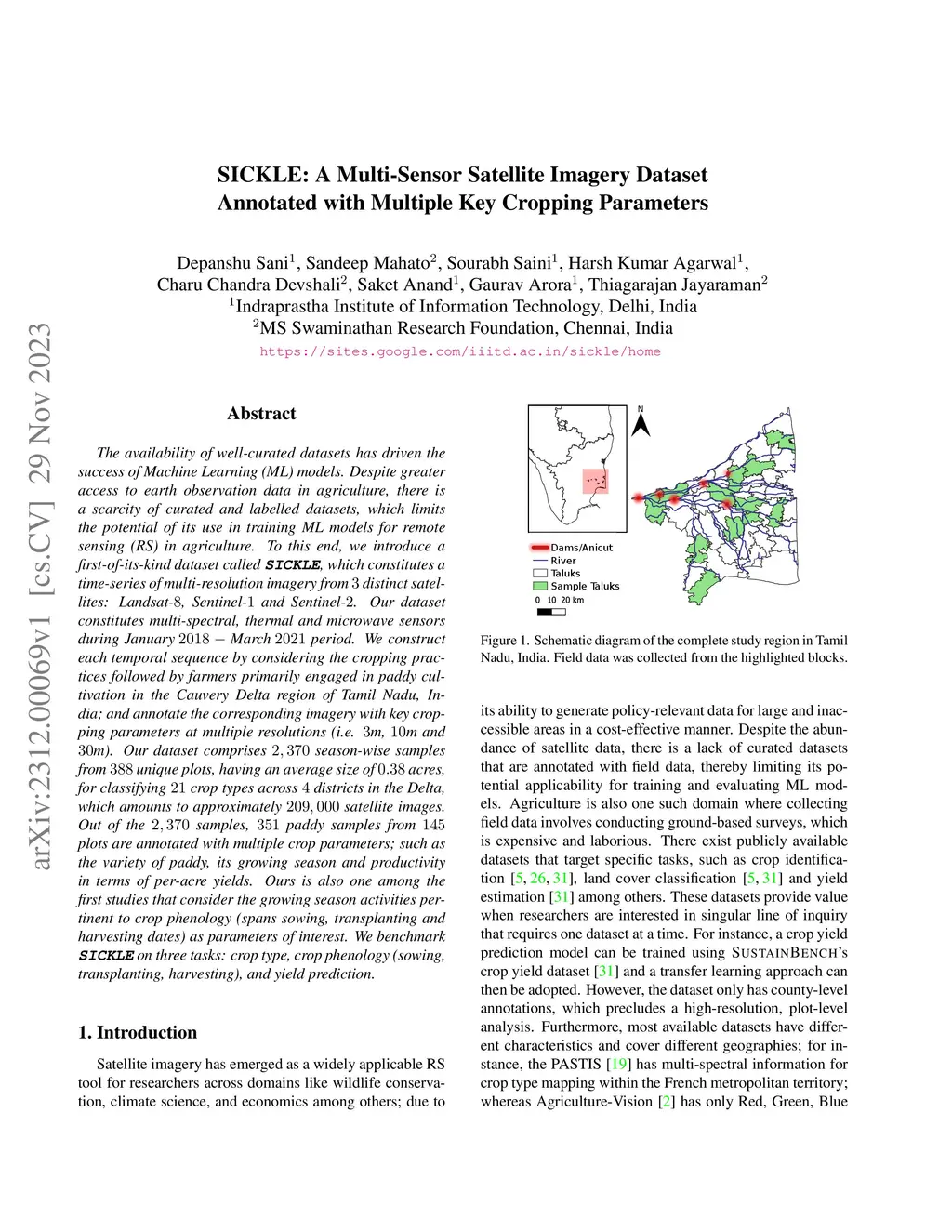 The availability of well-curated datasets has driven the success of Machine Learning (ML) models. Despite greater access to earth observation data in agriculture, there is a scarcity of curated and labelled datasets, which limits the potential of its use in training ML models for remote sensing (RS) in agriculture. To this end, we introduce a first-of-its-kind dataset called SICKLE, which constitutes a time-series of multi-resolution imagery from 3 distinct satellites: Landsat-8, Sentinel-1 and Sentinel-2. Our dataset constitutes multi-spectral, thermal and microwave sensors during January 2018 - March 2021 period. We construct each temporal sequence by considering the cropping practices followed by farmers primarily engaged in paddy cultivation in the Cauvery Delta region of Tamil Nadu, India; and annotate the corresponding imagery with key cropping parameters at multiple resolutions (i.e. 3m, 10m and 30m). Our dataset comprises 2,370 season-wise samples from 388 unique plots, having an average size of 0.38 acres, for classifying 21 crop types across 4 districts in the Delta, which amounts to approximately 209,000 satellite images. Out of the 2,370 samples, 351 paddy samples from 145 plots are annotated with multiple crop parameters; such as the variety of paddy, its growing season and productivity in terms of per-acre yields. Ours is also one among the first studies that consider the growing season activities pertinent to crop phenology (spans sowing, transplanting and harvesting dates) as parameters of interest. We benchmark SICKLE on three tasks: crop type, crop phenology (sowing, transplanting, harvesting), and yield prediction