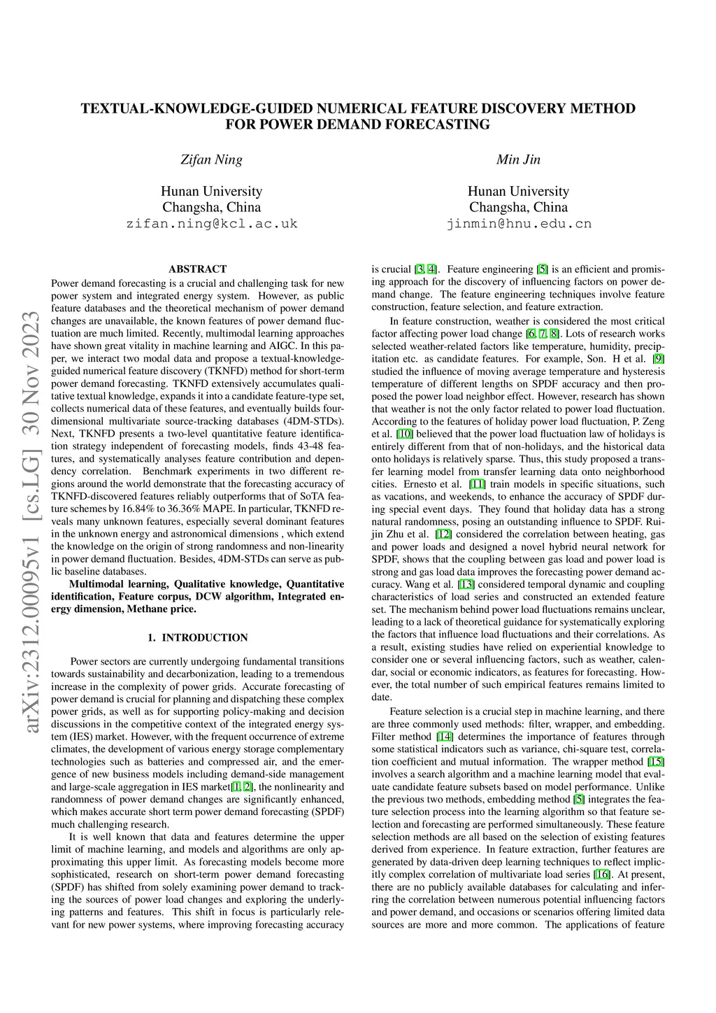 Power demand forecasting is a crucial and challenging task for new power system and integrated energy system. However, as public feature databases and the theoretical mechanism of power demand changes are unavailable, the known features of power demand fluctuation are much limited. Recently, multimodal learning approaches have shown great vitality in machine learning and AIGC. In this paper, we interact two modal data and propose a textual-knowledge-guided numerical feature discovery (TKNFD) method for short-term power demand forecasting. TKNFD extensively accumulates qualitative textual knowledge, expands it into a candidate feature-type set, collects numerical data of these features, and eventually builds four-dimensional multivariate source-tracking databases (4DM-STDs). Next, TKNFD presents a two-level quantitative feature identification strategy independent of forecasting models, finds 43-48 features, and systematically analyses feature contribution and dependency correlation. Benchmark experiments in two different regions around the world demonstrate that the forecasting accuracy of TKNFD-discovered features reliably outperforms that of SoTA feature schemes by 16.84% to 36.36% MAPE. In particular, TKNFD reveals many unknown features, especially several dominant features in the unknown energy and astronomical dimensions, which extend the knowledge on the origin of strong randomness and non-linearity in power demand fluctuation. Besides, 4DM-STDs can serve as public baseline databases.