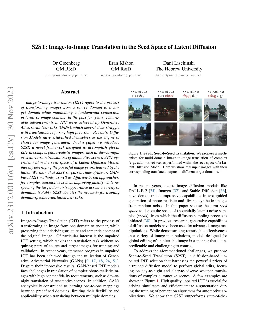 Image-to-image translation (I2IT) refers to the process of transforming images from a source domain to a target domain while maintaining a fundamental connection in terms of image content. In the past few years, remarkable advancements in I2IT were achieved by Generative Adversarial Networks (GANs), which nevertheless struggle with translations requiring high precision. Recently, Diffusion Models have established themselves as the engine of choice for image generation. In this paper we introduce S2ST, a novel framework designed to accomplish global I2IT in complex photorealistic images, such as day-to-night or clear-to-rain translations of automotive scenes. S2ST operates within the seed space of a Latent Diffusion Model, thereby leveraging the powerful image priors learned by the latter. We show that S2ST surpasses state-of-the-art GAN-based I2IT methods, as well as diffusion-based approaches, for complex automotive scenes, improving fidelity while respecting the target domain's appearance across a variety of domains. Notably, S2ST obviates the necessity for training domain-specific translation networks.