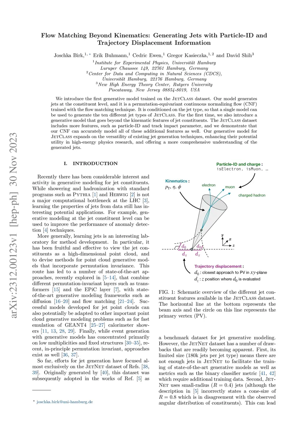 Flow Matching Beyond Kinematics: Generating Jets with Particle-ID and Trajectory Displacement Information