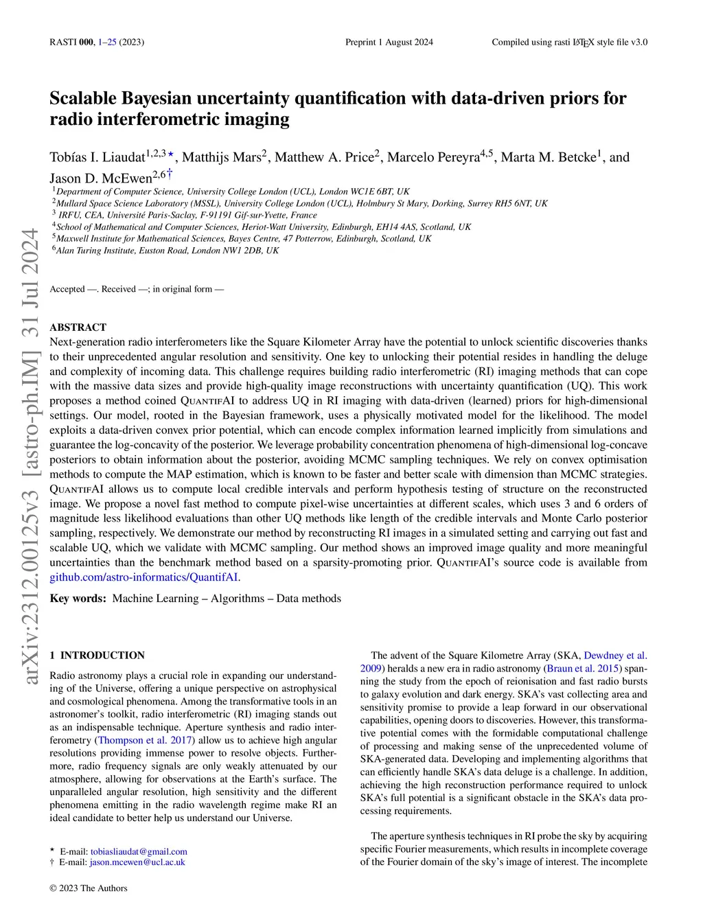 Next-generation radio interferometers like the Square Kilometer Array have the potential to unlock scientific discoveries thanks to their unprecedented angular resolution and sensitivity. One key to unlocking their potential resides in handling the deluge and complexity of incoming data. This challenge requires building radio interferometric imaging methods that can cope with the massive data sizes and provide high-quality image reconstructions with uncertainty quantification (UQ). This work proposes a method coined QuantifAI to address UQ in radio-interferometric imaging with data-driven (learned) priors for high-dimensional settings. Our model, rooted in the Bayesian framework, uses a physically motivated model for the likelihood. The model exploits a data-driven convex prior, which can encode complex information learned implicitly from simulations and guarantee the log-concavity of the posterior. We leverage probability concentration phenomena of high-dimensional log-concave posteriors that let us obtain information about the posterior, avoiding MCMC sampling techniques. We rely on convex optimisation methods to compute the MAP estimation, which is known to be faster and better scale with dimension than MCMC sampling strategies. Our method allows us to compute local credible intervals, i.e., Bayesian error bars, and perform hypothesis testing of structure on the reconstructed image. In addition, we propose a novel blazing-fast method to compute pixel-wise uncertainties at different scales. We demonstrate our method by reconstructing radio-interferometric images in a simulated setting and carrying out fast and scalable UQ, which we validate with MCMC sampling. Our method shows an improved image quality and more meaningful uncertainties than the benchmark method based on a sparsity-promoting prior. QuantifAI's source code: https://github.com/astro-informatics/QuantifAI.