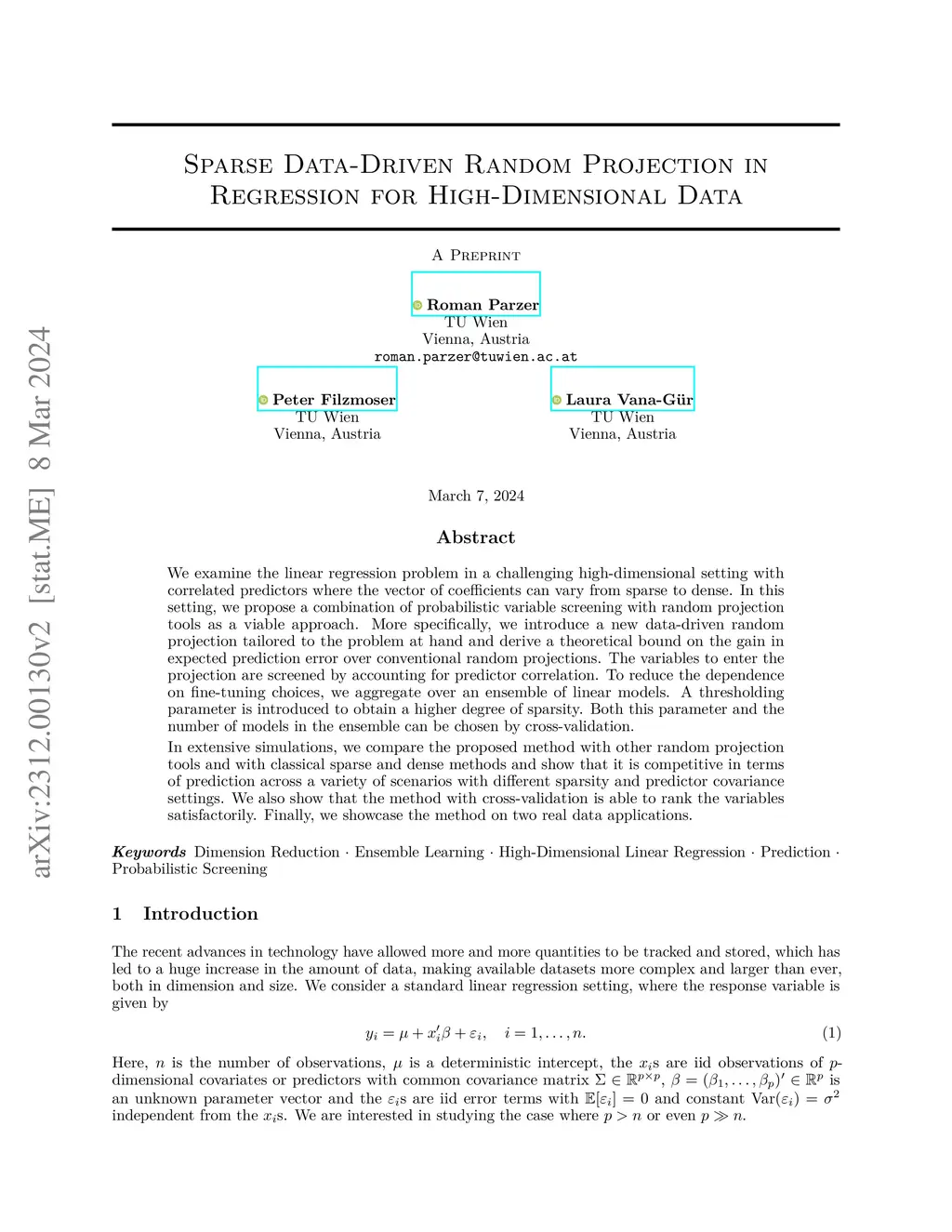 We examine the linear regression problem in a challenging high-dimensional setting with correlated predictors where the vector of coefficients can vary from sparse to dense. In this setting, we propose a combination of probabilistic variable screening with random projection tools as a viable approach. More specifically, we introduce a new data-driven random projection tailored to the problem at hand and derive a theoretical bound on the gain in expected prediction error over conventional random projections. The variables to enter the projection are screened by accounting for predictor correlation. To reduce the dependence on fine-tuning choices, we aggregate over an ensemble of linear models. A thresholding parameter is introduced to obtain a higher degree of sparsity. Both this parameter and the number of models in the ensemble can be chosen by cross-validation. In extensive simulations, we compare the proposed method with other random projection tools and with classical sparse and dense methods and show that it is competitive in terms of prediction across a variety of scenarios with different sparsity and predictor covariance settings. We also show that the method with cross-validation is able to rank the variables satisfactorily. Finally, we showcase the method on two real data applications.