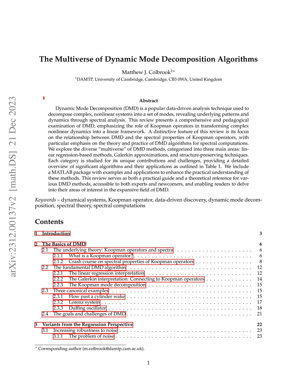 Dynamic Mode Decomposition (DMD) is a popular data-driven analysis technique used to decompose complex, nonlinear systems into a set of modes, revealing underlying patterns and dynamics through spectral analysis. This review presents a comprehensive and pedagogical examination of DMD, emphasizing the role of Koopman operators in transforming complex nonlinear dynamics into a linear framework. A distinctive feature of this review is its focus on the relationship between DMD and the spectral properties of Koopman operators, with particular emphasis on the theory and practice of DMD algorithms for spectral computations. We explore the diverse "multiverse" of DMD methods, categorized into three main areas: linear regression-based methods, Galerkin approximations, and structure-preserving techniques. Each category is studied for its unique contributions and challenges, providing a detailed overview of significant algorithms and their applications as outlined in Table 1. We include a MATLAB package with examples and applications to enhance the practical understanding of these methods. This review serves as both a practical guide and a theoretical reference for various DMD methods, accessible to both experts and newcomers, and enabling readers to delve into their areas of interest in the expansive field of DMD.