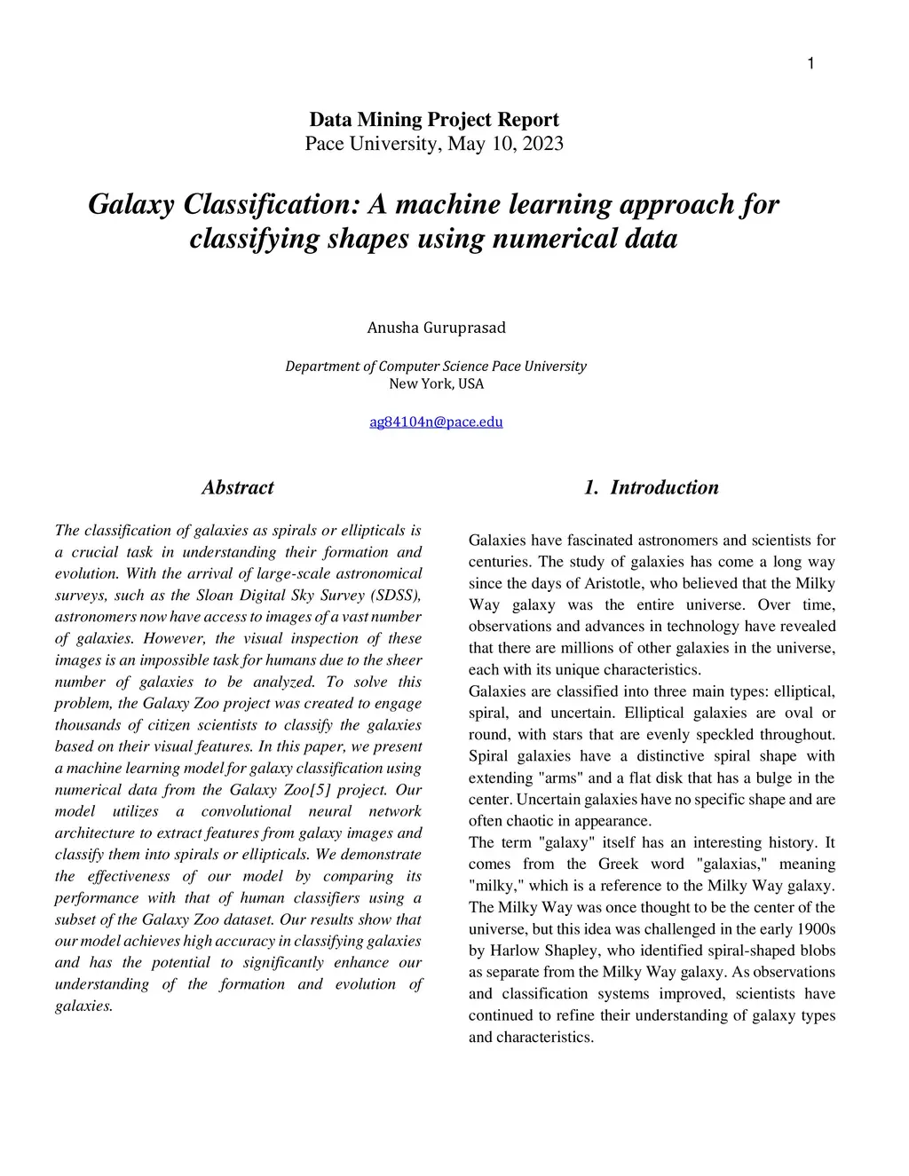 The classification of galaxies as spirals or ellipticals is a crucial task in understanding their formation and evolution. With the arrival of large-scale astronomical surveys, such as the Sloan Digital Sky Survey (SDSS), astronomers now have access to images of a vast number of galaxies. However, the visual inspection of these images is an impossible task for humans due to the sheer number of galaxies to be analyzed. To solve this problem, the Galaxy Zoo project was created to engage thousands of citizen scientists to classify the galaxies based on their visual features. In this paper, we present a machine learning model for galaxy classification using numerical data from the Galaxy Zoo[5] project. Our model utilizes a convolutional neural network architecture to extract features from galaxy images and classify them into spirals or ellipticals. We demonstrate the effectiveness of our model by comparing its performance with that of human classifiers using a subset of the Galaxy Zoo dataset. Our results show that our model achieves high accuracy in classifying galaxies and has the potential to significantly enhance our understanding of the formation and evolution of galaxies.