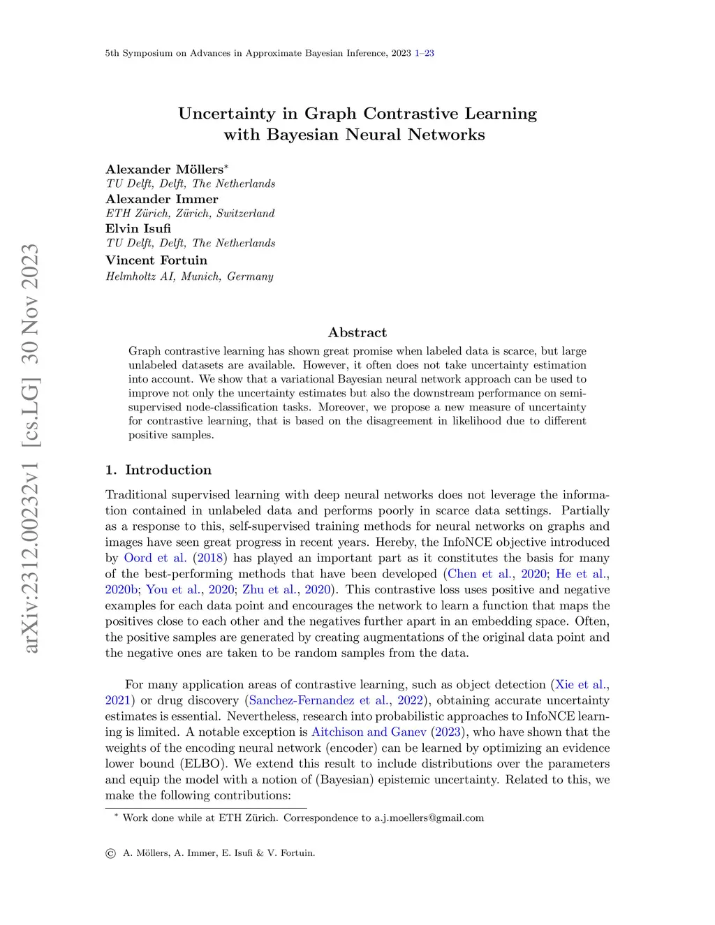 Graph contrastive learning has shown great promise when labeled data is scarce, but large unlabeled datasets are available. However, it often does not take uncertainty estimation into account. We show that a variational Bayesian neural network approach can be used to improve not only the uncertainty estimates but also the downstream performance on semi-supervised node-classification tasks. Moreover, we propose a new measure of uncertainty for contrastive learning, that is based on the disagreement in likelihood due to different positive samples.