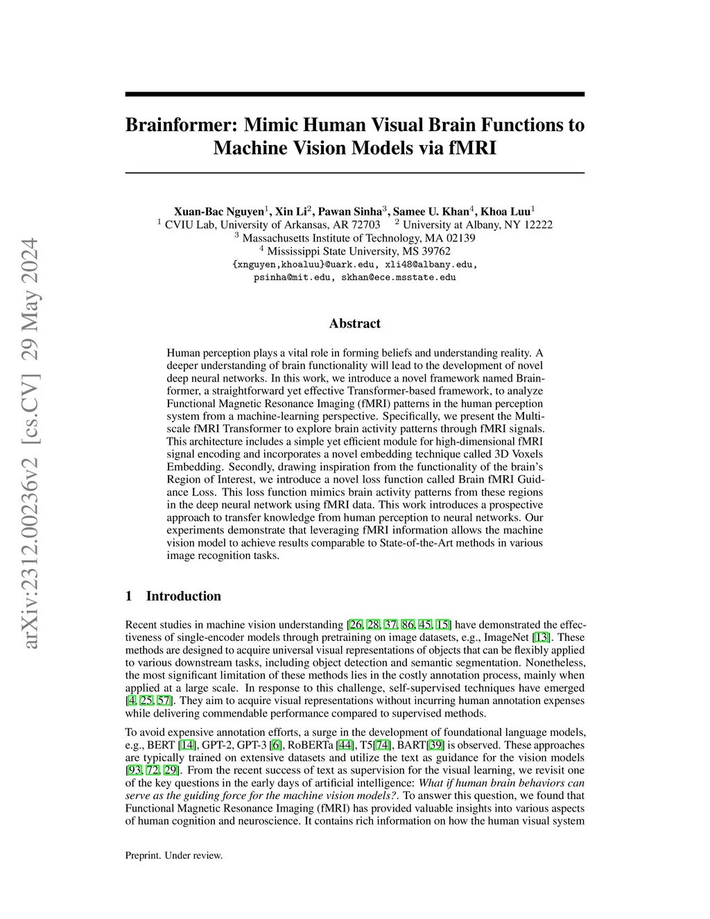 Human perception plays a vital role in forming beliefs and understanding reality. A deeper understanding of brain functionality will lead to the development of novel deep neural networks. In this work, we introduce a novel framework named Brainformer, a straightforward yet effective Transformer-based framework, to analyze Functional Magnetic Resonance Imaging (fMRI) patterns in the human perception system from a machine-learning perspective. Specifically, we present the Multi-scale fMRI Transformer to explore brain activity patterns through fMRI signals. This architecture includes a simple yet efficient module for high-dimensional fMRI signal encoding and incorporates a novel embedding technique called 3D Voxels Embedding. Secondly, drawing inspiration from the functionality of the brain's Region of Interest, we introduce a novel loss function called Brain fMRI Guidance Loss. This loss function mimics brain activity patterns from these regions in the deep neural network using fMRI data. This work introduces a prospective approach to transfer knowledge from human perception to neural networks. Our experiments demonstrate that leveraging fMRI information allows the machine vision model to achieve results comparable to State-of-the-Art methods in various image recognition tasks.