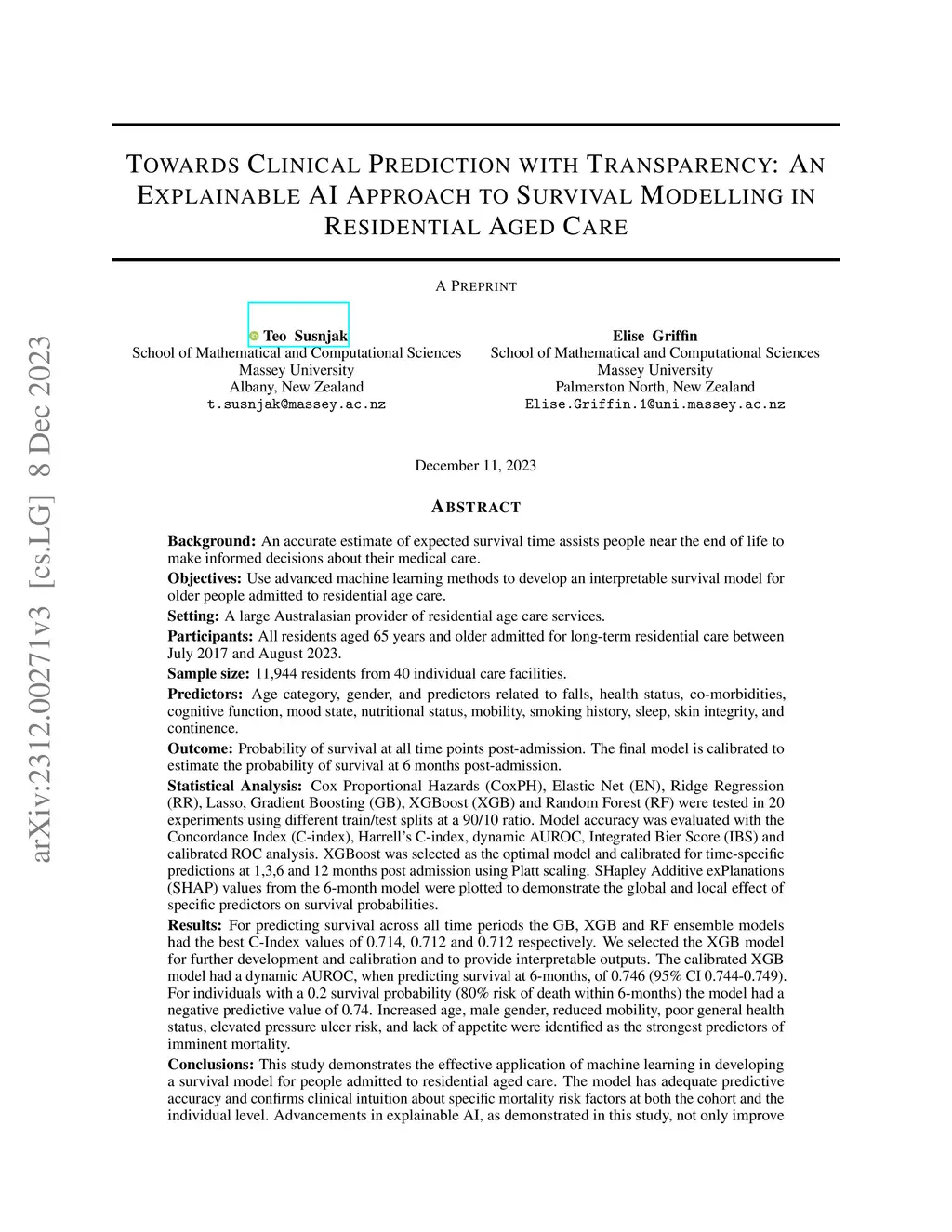 Background: Accurate survival time estimates aid end-of-life medical decision-making. Objectives: Develop an interpretable survival model for elderly residential aged care residents using advanced machine learning. Setting: A major Australasian residential aged care provider. Participants: Residents aged 65+ admitted for long-term care from July 2017 to August 2023. Sample size: 11,944 residents across 40 facilities. Predictors: Factors include age, gender, health status, co-morbidities, cognitive function, mood, nutrition, mobility, smoking, sleep, skin integrity, and continence. Outcome: Probability of survival post-admission, specifically calibrated for 6-month survival estimates. Statistical Analysis: Tested CoxPH, EN, RR, Lasso, GB, XGB, and RF models in 20 experiments with a 90/10 train/test split. Evaluated accuracy using C-index, Harrell's C-index, dynamic AUROC, IBS, and calibrated ROC. Chose XGB for its performance and calibrated it for 1, 3, 6, and 12-month predictions using Platt scaling. Employed SHAP values to analyze predictor impacts. Results: GB, XGB, and RF models showed the highest C-Index values (0.714, 0.712, 0.712). The optimal XGB model demonstrated a 6-month survival prediction AUROC of 0.746 (95% CI 0.744-0.749). Key mortality predictors include age, male gender, mobility, health status, pressure ulcer risk, and appetite. Conclusions: The study successfully applies machine learning to create a survival model for aged care, aligning with clinical insights on mortality risk factors and enhancing model interpretability and clinical utility through explainable AI.