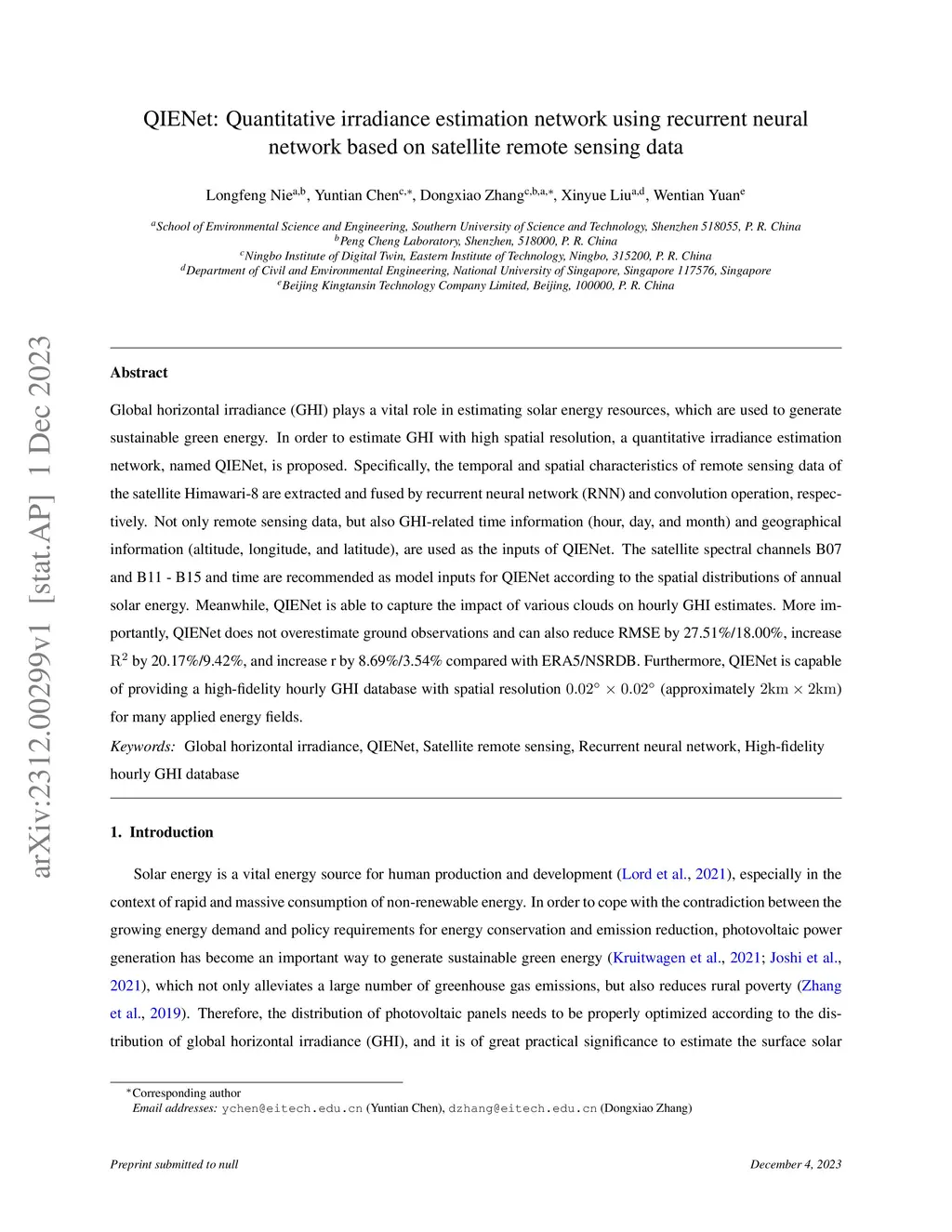 Global horizontal irradiance (GHI) plays a vital role in estimating solar energy resources, which are used to generate sustainable green energy. In order to estimate GHI with high spatial resolution, a quantitative irradiance estimation network, named QIENet, is proposed. Specifically, the temporal and spatial characteristics of remote sensing data of the satellite Himawari-8 are extracted and fused by recurrent neural network (RNN) and convolution operation, respectively. Not only remote sensing data, but also GHI-related time information (hour, day, and month) and geographical information (altitude, longitude, and latitude), are used as the inputs of QIENet. The satellite spectral channels B07 and B11 - B15 and time are recommended as model inputs for QIENet according to the spatial distributions of annual solar energy. Meanwhile, QIENet is able to capture the impact of various clouds on hourly GHI estimates. More importantly, QIENet does not overestimate ground observations and can also reduce RMSE by 27.51%/18.00%, increase R2 by 20.17%/9.42%, and increase r by 8.69%/3.54% compared with ERA5/NSRDB. Furthermore, QIENet is capable of providing a high-fidelity hourly GHI database with spatial resolution 0.02{\deg} * 0.02{\deg}(approximately 2km * 2km) for many applied energy fields.