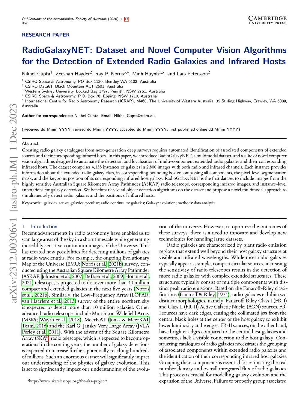 Creating radio galaxy catalogues from next-generation deep surveys requires automated identification of associated components of extended sources and their corresponding infrared hosts. In this paper, we introduce RadioGalaxyNET, a multimodal dataset, and a suite of novel computer vision algorithms designed to automate the detection and localization of multi-component extended radio galaxies and their corresponding infrared hosts. The dataset comprises 4,155 instances of galaxies in 2,800 images with both radio and infrared channels. Each instance provides information about the extended radio galaxy class, its corresponding bounding box encompassing all components, the pixel-level segmentation mask, and the keypoint position of its corresponding infrared host galaxy. RadioGalaxyNET is the first dataset to include images from the highly sensitive Australian Square Kilometre Array Pathfinder (ASKAP) radio telescope, corresponding infrared images, and instance-level annotations for galaxy detection. We benchmark several object detection algorithms on the dataset and propose a novel multimodal approach to simultaneously detect radio galaxies and the positions of infrared hosts.