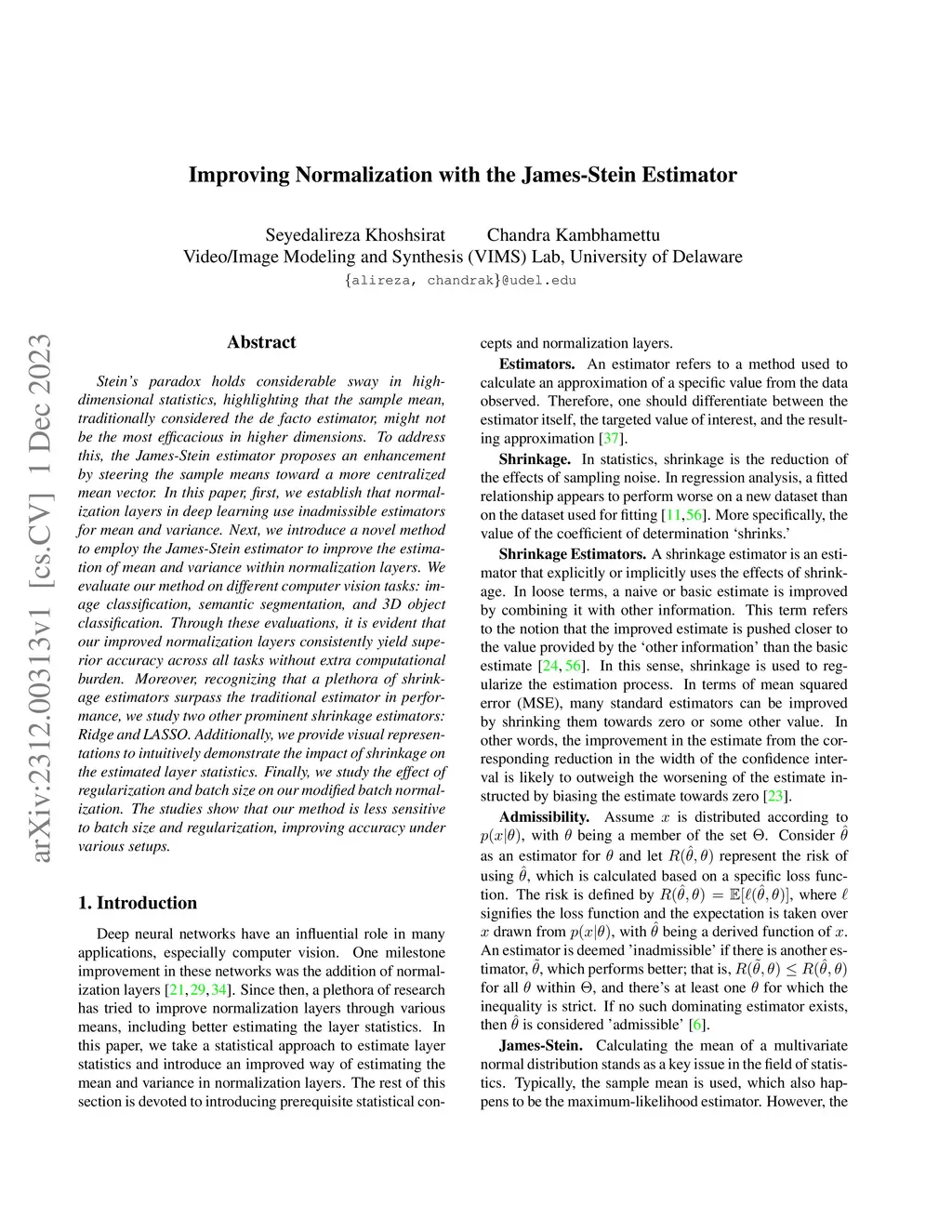 Stein's paradox holds considerable sway in high-dimensional statistics, highlighting that the sample mean, traditionally considered the de facto estimator, might not be the most efficacious in higher dimensions. To address this, the James-Stein estimator proposes an enhancement by steering the sample means toward a more centralized mean vector. In this paper, first, we establish that normalization layers in deep learning use inadmissible estimators for mean and variance. Next, we introduce a novel method to employ the James-Stein estimator to improve the estimation of mean and variance within normalization layers. We evaluate our method on different computer vision tasks: image classification, semantic segmentation, and 3D object classification. Through these evaluations, it is evident that our improved normalization layers consistently yield superior accuracy across all tasks without extra computational burden. Moreover, recognizing that a plethora of shrinkage estimators surpass the traditional estimator in performance, we study two other prominent shrinkage estimators: Ridge and LASSO. Additionally, we provide visual representations to intuitively demonstrate the impact of shrinkage on the estimated layer statistics. Finally, we study the effect of regularization and batch size on our modified batch normalization. The studies show that our method is less sensitive to batch size and regularization, improving accuracy under various setups.