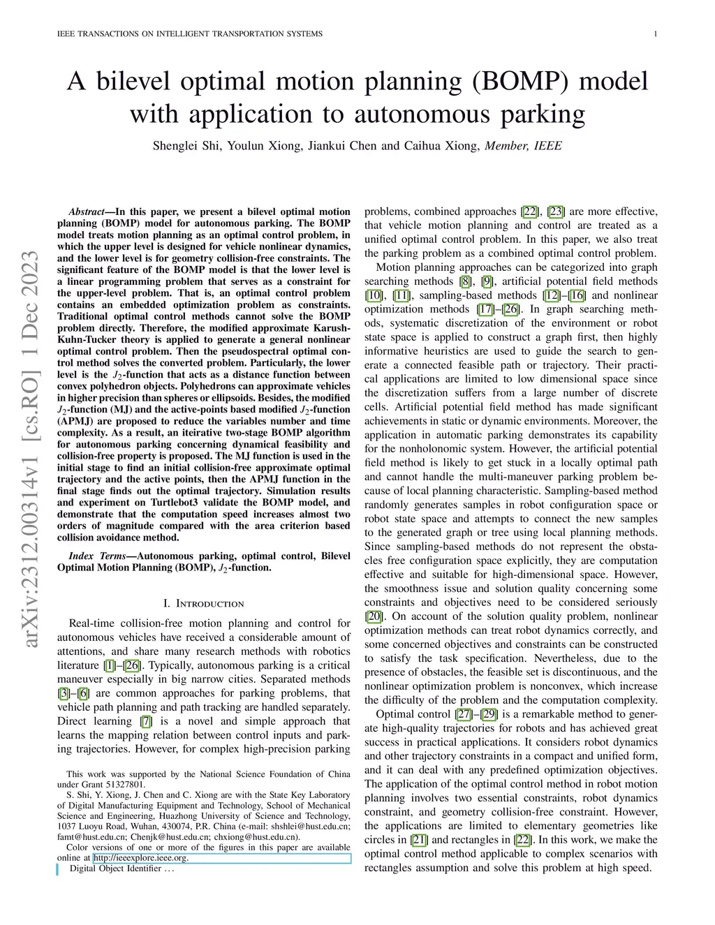 In this paper, we present a bilevel optimal motion planning (BOMP) model for autonomous parking. The BOMP model treats motion planning as an optimal control problem, in which the upper level is designed for vehicle nonlinear dynamics, and the lower level is for geometry collision-free constraints. The significant feature of the BOMP model is that the lower level is a linear programming problem that serves as a constraint for the upper-level problem. That is, an optimal control problem contains an embedded optimization problem as constraints. Traditional optimal control methods cannot solve the BOMP problem directly. Therefore, the modified approximate Karush-Kuhn-Tucker theory is applied to generate a general nonlinear optimal control problem. Then the pseudospectral optimal control method solves the converted problem. Particularly, the lower level is the -function that acts as a distance function between convex polyhedron objects. Polyhedrons can approximate vehicles in higher precision than spheres or ellipsoids. Besides, the modified -function (MJ) and the active-points based modified -function (APMJ) are proposed to reduce the variables number and time complexity. As a result, an iteirative two-stage BOMP algorithm for autonomous parking concerning dynamical feasibility and collision-free property is proposed. The MJ function is used in the initial stage to find an initial collision-free approximate optimal trajectory and the active points, then the APMJ function in the final stage finds out the optimal trajectory. Simulation results and experiment on Turtlebot3 validate the BOMP model, and demonstrate that the computation speed increases almost two orders of magnitude compared with the area criterion based collision avoidance method.