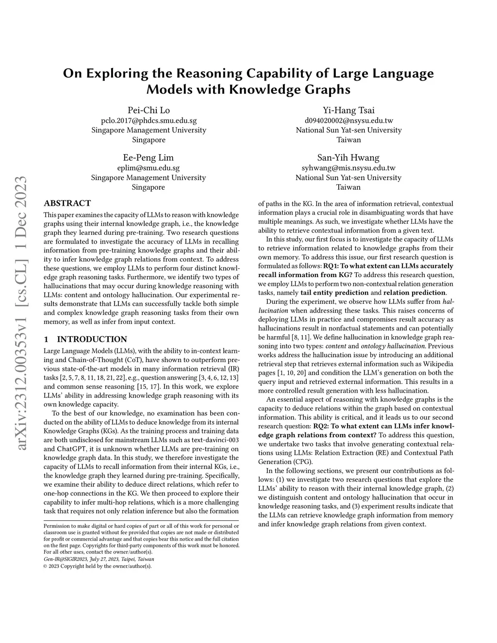 This paper examines the capacity of LLMs to reason with knowledge graphs using their internal knowledge graph, i.e., the knowledge graph they learned during pre-training. Two research questions are formulated to investigate the accuracy of LLMs in recalling information from pre-training knowledge graphs and their ability to infer knowledge graph relations from context. To address these questions, we employ LLMs to perform four distinct knowledge graph reasoning tasks. Furthermore, we identify two types of hallucinations that may occur during knowledge reasoning with LLMs: content and ontology hallucination. Our experimental results demonstrate that LLMs can successfully tackle both simple and complex knowledge graph reasoning tasks from their own memory, as well as infer from input context.