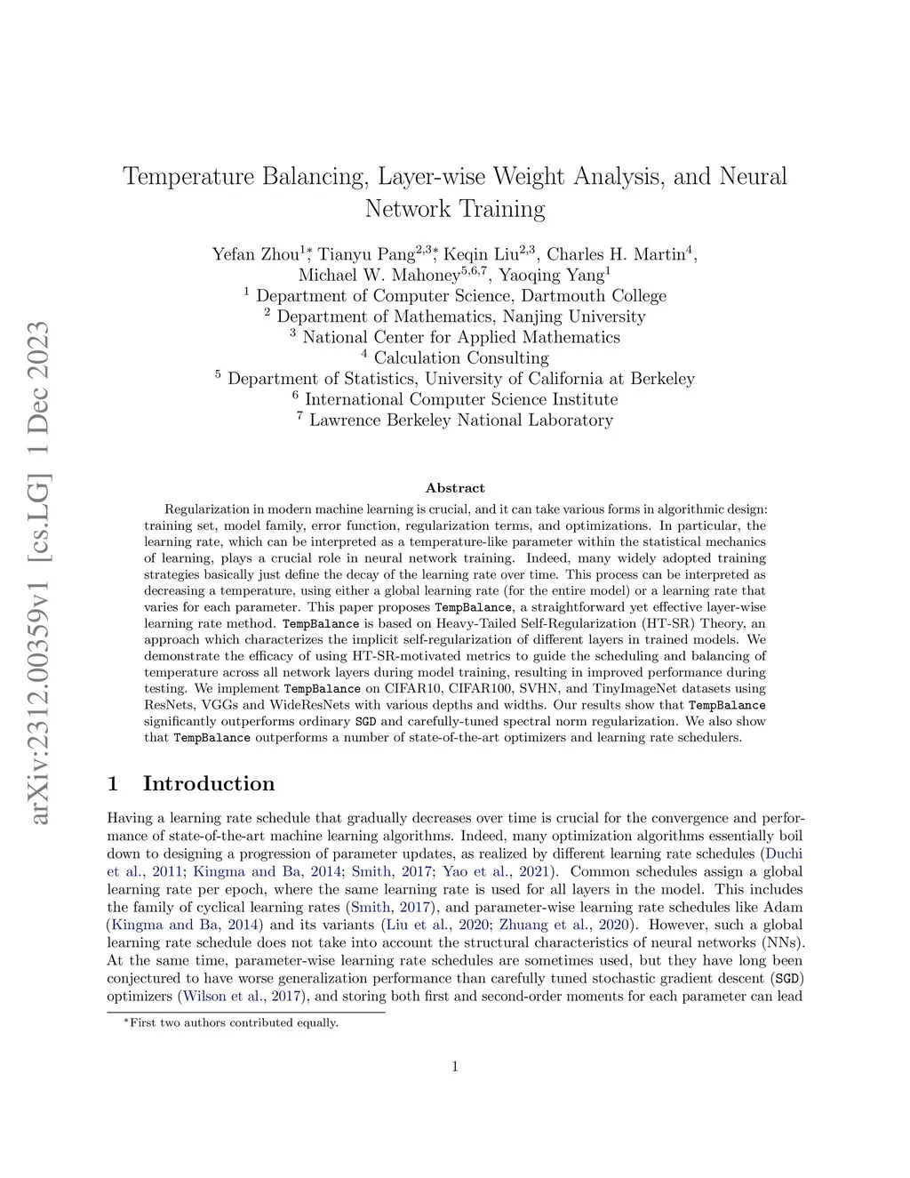 Regularization in modern machine learning is crucial, and it can take various forms in algorithmic design: training set, model family, error function, regularization terms, and optimizations. In particular, the learning rate, which can be interpreted as a temperature-like parameter within the statistical mechanics of learning, plays a crucial role in neural network training. Indeed, many widely adopted training strategies basically just define the decay of the learning rate over time. This process can be interpreted as decreasing a temperature, using either a global learning rate (for the entire model) or a learning rate that varies for each parameter. This paper proposes TempBalance, a straightforward yet effective layer-wise learning rate method. TempBalance is based on Heavy-Tailed Self-Regularization (HT-SR) Theory, an approach which characterizes the implicit self-regularization of different layers in trained models. We demonstrate the efficacy of using HT-SR-motivated metrics to guide the scheduling and balancing of temperature across all network layers during model training, resulting in improved performance during testing. We implement TempBalance on CIFAR10, CIFAR100, SVHN, and TinyImageNet datasets using ResNets, VGGs, and WideResNets with various depths and widths. Our results show that TempBalance significantly outperforms ordinary SGD and carefully-tuned spectral norm regularization. We also show that TempBalance outperforms a number of state-of-the-art optimizers and learning rate schedulers.