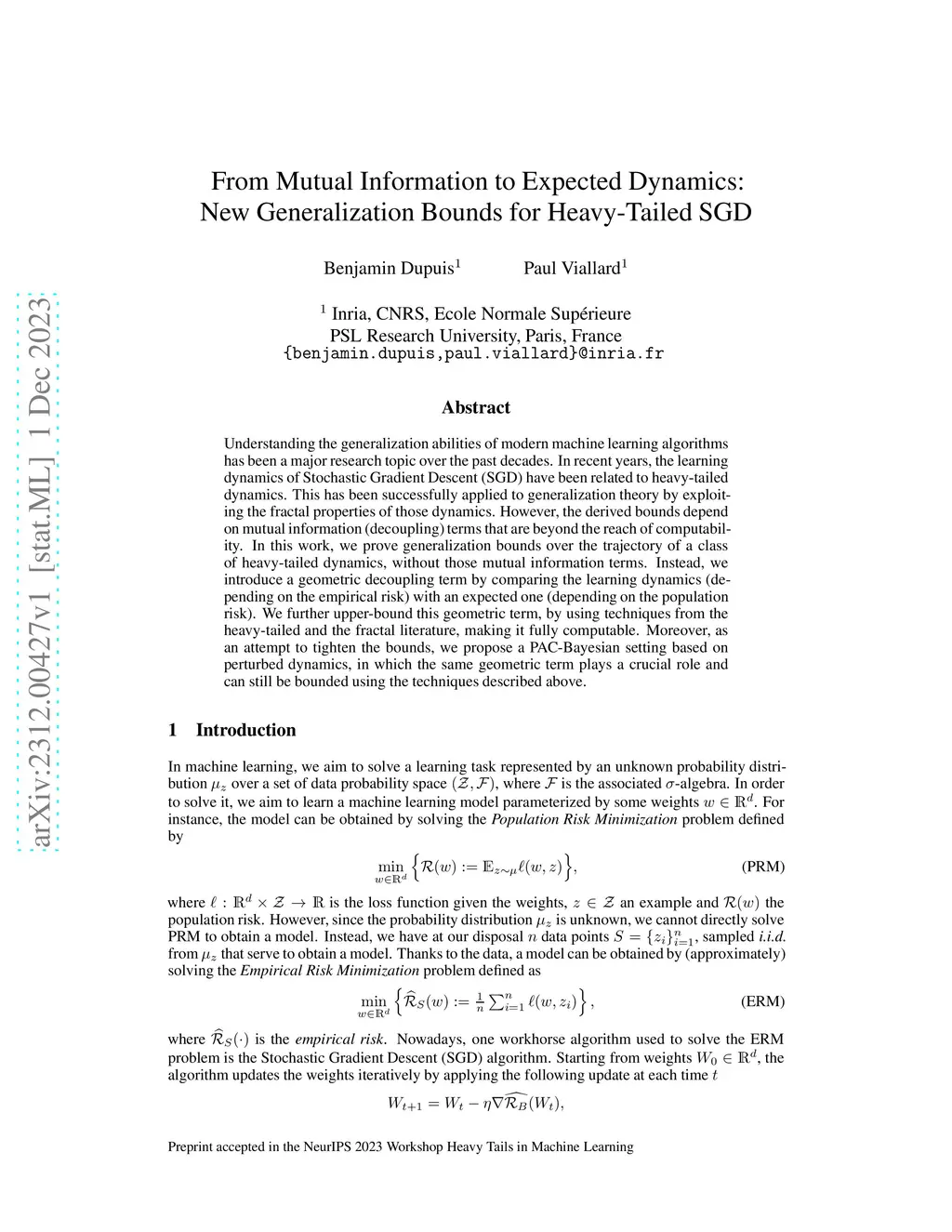 Understanding the generalization abilities of modern machine learning algorithms has been a major research topic over the past decades. In recent years, the learning dynamics of Stochastic Gradient Descent (SGD) have been related to heavy-tailed dynamics. This has been successfully applied to generalization theory by exploiting the fractal properties of those dynamics. However, the derived bounds depend on mutual information (decoupling) terms that are beyond the reach of computability. In this work, we prove generalization bounds over the trajectory of a class of heavy-tailed dynamics, without those mutual information terms. Instead, we introduce a geometric decoupling term by comparing the learning dynamics (depending on the empirical risk) with an expected one (depending on the population risk). We further upper-bound this geometric term, by using techniques from the heavy-tailed and the fractal literature, making it fully computable. Moreover, as an attempt to tighten the bounds, we propose a PAC-Bayesian setting based on perturbed dynamics, in which the same geometric term plays a crucial role and can still be bounded using the techniques described above.
