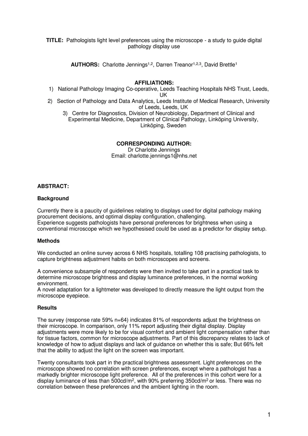 There is a paucity of guidelines relating to displays in digital pathology making procurement decisions, and display configuration challenging. Experience suggests pathologists have personal preferences for brightness when using a microscope which we hypothesised could be used as a predictor for display setup. We conducted an online survey across 6 NHS hospitals to capture brightness adjustment habits on both microscopes and screens. A subsample of respondents took part in a practical task to determine microscope brightness and display luminance preferences. The survey indicates 81% of respondents adjust the brightness on their microscope, compared with 11% adjusting their digital display. Display adjustments are more likely for visual comfort and ambient light compensation rather than for tissue factors, common for microscope adjustments. Twenty consultants took part in the practical brightness assessment. Light preferences on the microscope showed no correlation with screen preferences, except where a pathologist has a markedly brighter microscope preference. All of the preferences in this cohort were for a display luminance of less than 500cd/m, with 90% preferring 350cd/m or less. There was no correlation between these preferences and the ambient lighting in the room. We conclude that microscope preferences can only be used to predict screen luminance requirements where the microscope is being used at very high brightness levels. A display capable of a brightness of 500cd/m should be suitable for almost all pathologists with 300cd/m suitable for the majority. The ability to adjust display luminance was felt to be important by the majority of respondents. Further work needs to be undertaken to establish the relationship between diagnostic performance, preferences and ambient lighting levels.