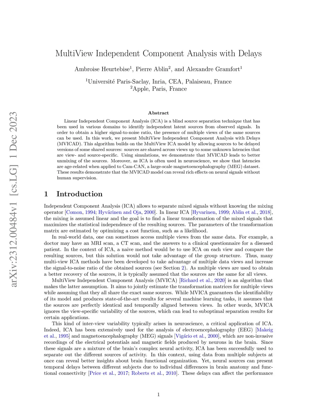 Linear Independent Component Analysis (ICA) is a blind source separation technique that has been used in various domains to identify independent latent sources from observed signals. In order to obtain a higher signal-to-noise ratio, the presence of multiple views of the same sources can be used. In this work, we present MultiView Independent Component Analysis with Delays (MVICAD). This algorithm builds on the MultiView ICA model by allowing sources to be delayed versions of some shared sources: sources are shared across views up to some unknown latencies that are view- and source-specific. Using simulations, we demonstrate that MVICAD leads to better unmixing of the sources. Moreover, as ICA is often used in neuroscience, we show that latencies are age-related when applied to Cam-CAN, a large-scale magnetoencephalography (MEG) dataset. These results demonstrate that the MVICAD model can reveal rich effects on neural signals without human supervision.